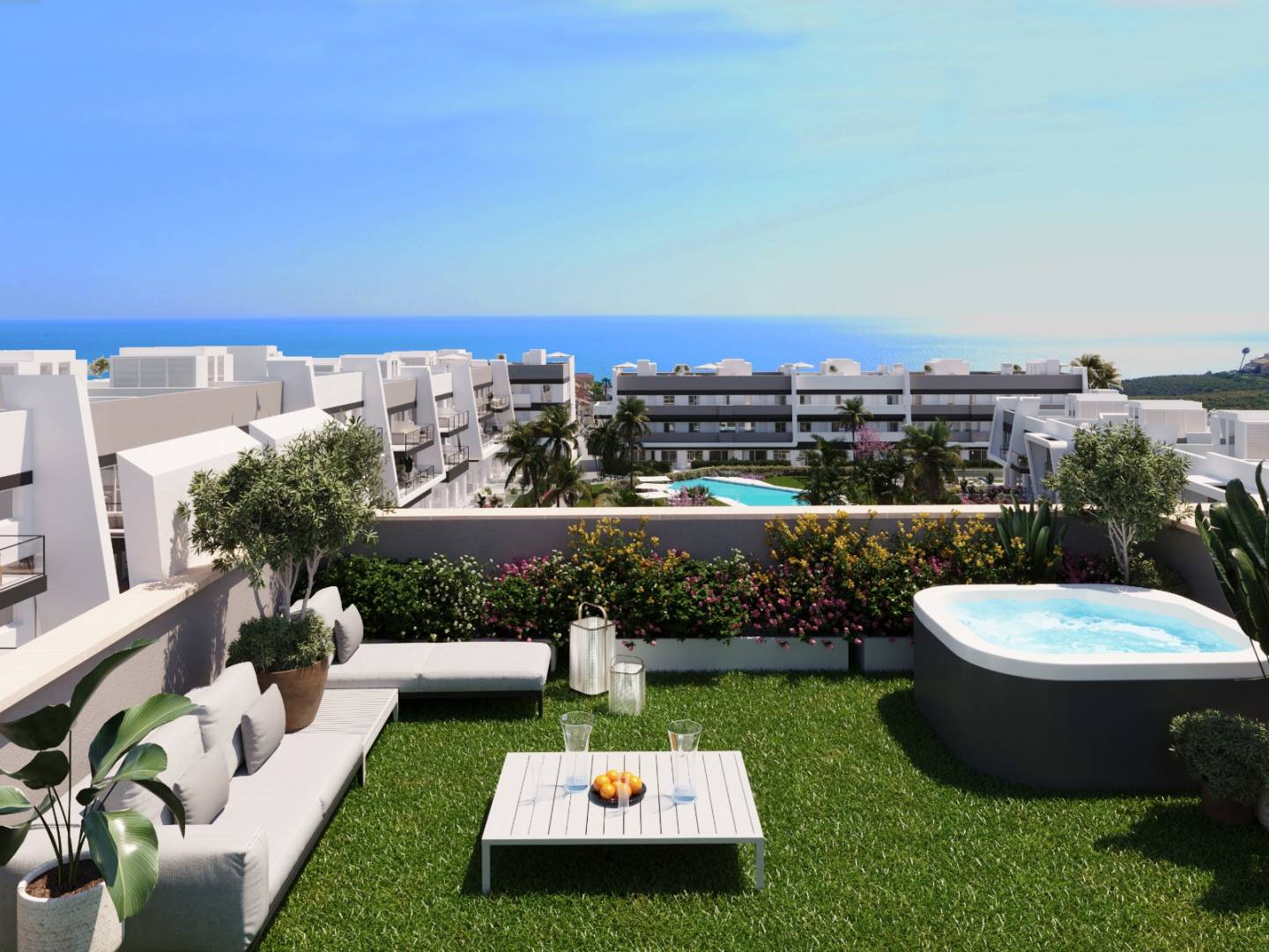 Unter den Optionen finden Sie Erdgeschosswohnungen mit Garten, Erdgeschosswohnungen mit Terrassen oder Penthäuser mit privatem Solarium.