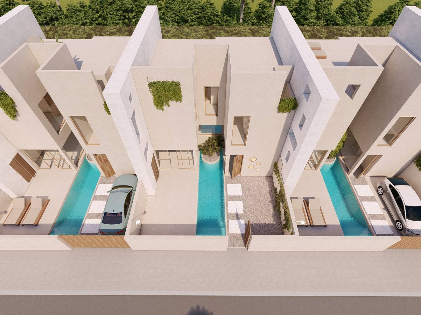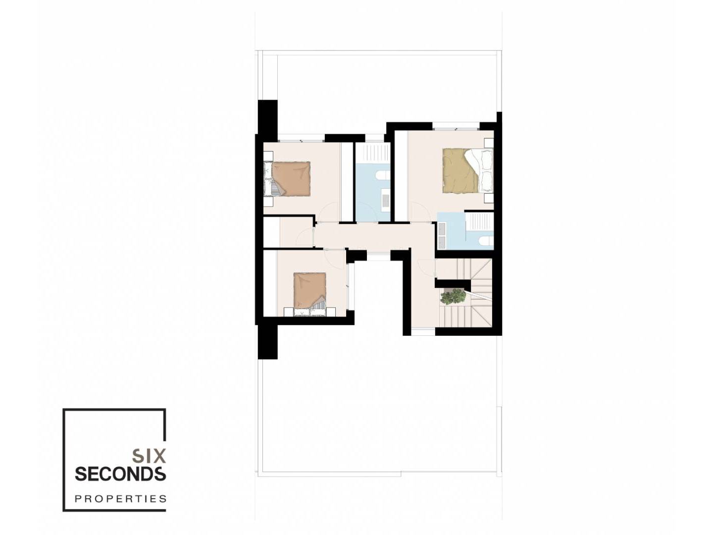 Im ersten Stock finden Sie 3 Schlafzimmer, 2 Badezimmer und einen Abstell-/Waschraum. Die gesamte Wohnfläche beträgt 157 m2. Jedes Haus verfügt außerdem über eine geräumige private Dachterrasse von nicht weniger als 60 m2 und Sie können auf Ihrem Grundstück parken, wenn Sie möchten.
