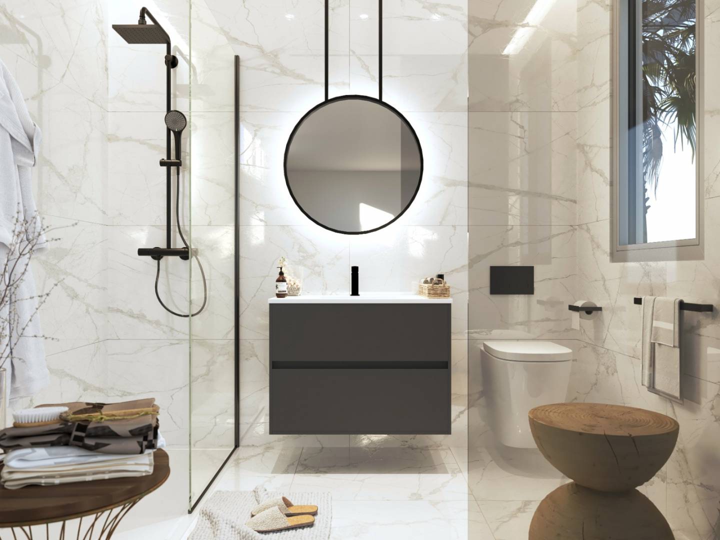 Insbesondere handelt es sich bei dieser Wohnung um ein Modell mit 3 Schlafzimmern, das sich im ersten Stock mit einer privaten Terrasse befindet. Alle Wohnungen verfügen über einen offenen Raum zwischen Küche und Wohnzimmer, Einbauschränke und Ankleidezimmer in den Schlafzimmern und zwei Badezimmer, eines davon ist ein Badezimmer mit dem Hauptschlafzimmer.