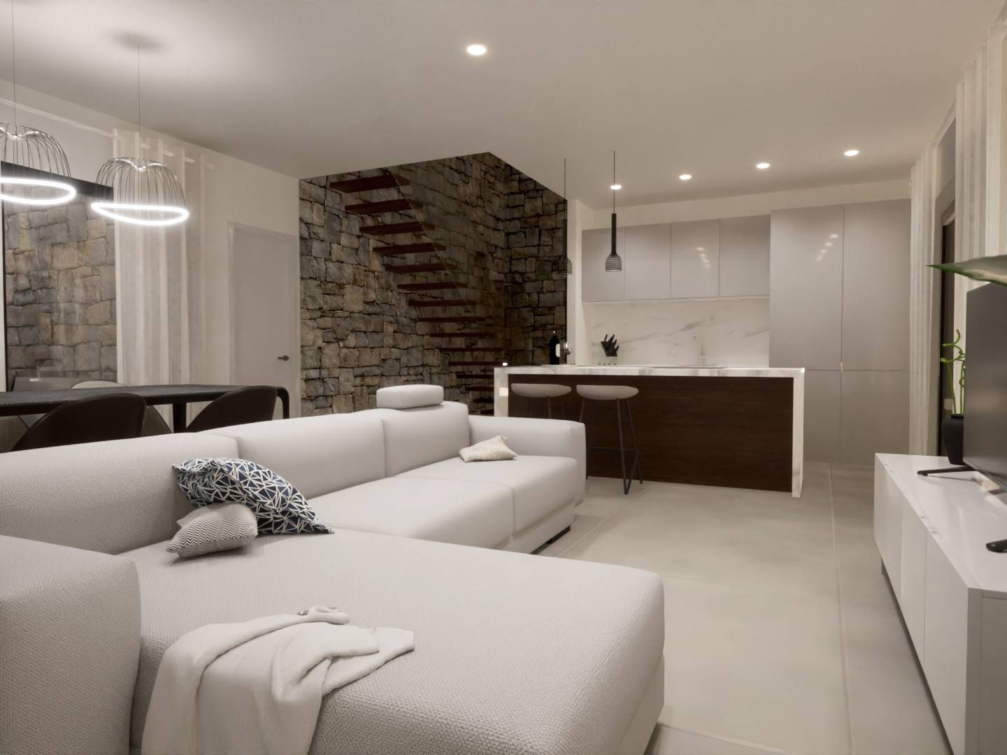 Im Erdgeschoss finden Sie ein geräumiges Wohn-Esszimmer mit großen Fenstern, die auf eine gemütliche Veranda und einen Garten führen, sowie eine moderne Küche mit offener Kochinsel , die es Ihnen ermöglicht, angenehme Abende mit Freunden zu genießen und gleichzeitig ein exquisites Abendessen zuzubereiten, ein Doppelzimmer Schlafzimmer mit eigenem Bad und Ankleidezimmer sowie ein Gäste- WC für Besucher. Eine elegante Holztreppe und eine Glasbalustrade führen in das Obergeschoss.