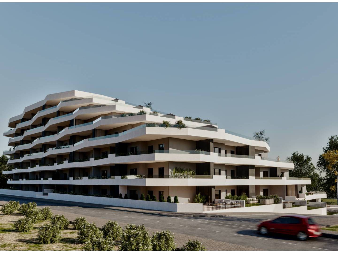Erdgeschosswohnungen können 2 oder 3 Schlafzimmer haben, mit großen Terrassen und privatem Parkplatz (innen oder außen).
