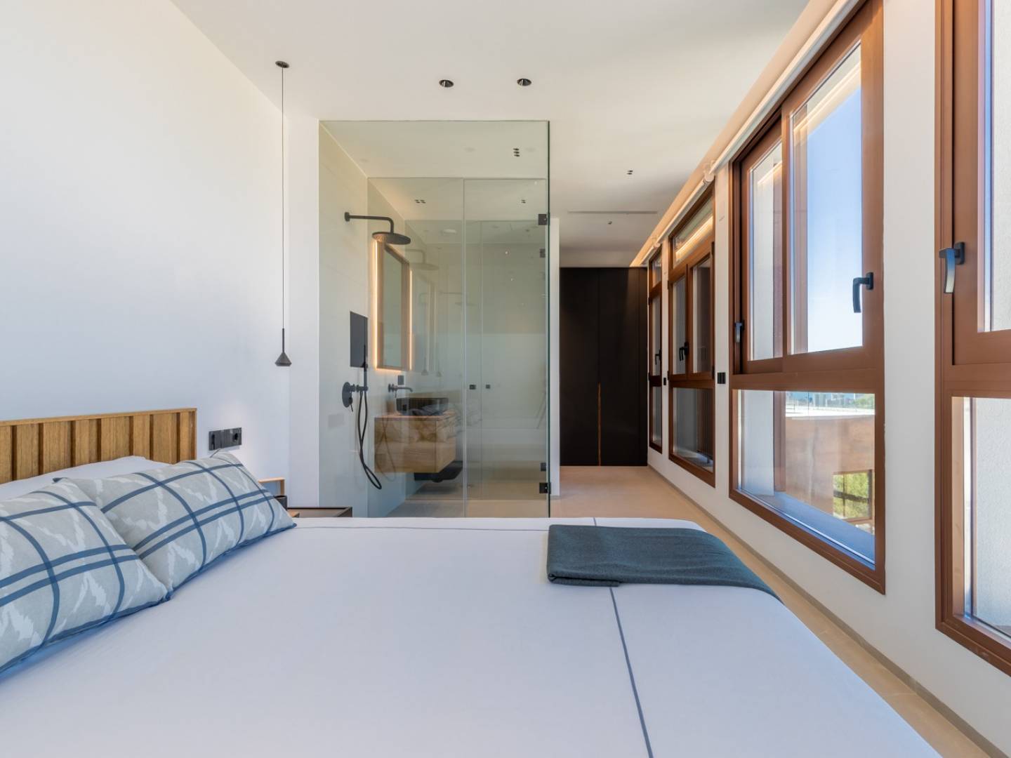 Es gibt ein großes Büro und vier komplette Suiten , jede mit Meerblick und zwei davon mit Zugang zu einer eigenen privaten Terrasse. Die Zimmer verfügen über ein elegantes und modernes Design mit minimalistischen Möbeln und Oberflächen in hellen Farbtönen, die eine ruhige und gelassene Umgebung schaffen. Alle Schlafzimmer verfügen über ein eigenes Bad und begehbare Kleiderschränke , was ein luxuriöses und komfortables Erlebnis gewährleistet.