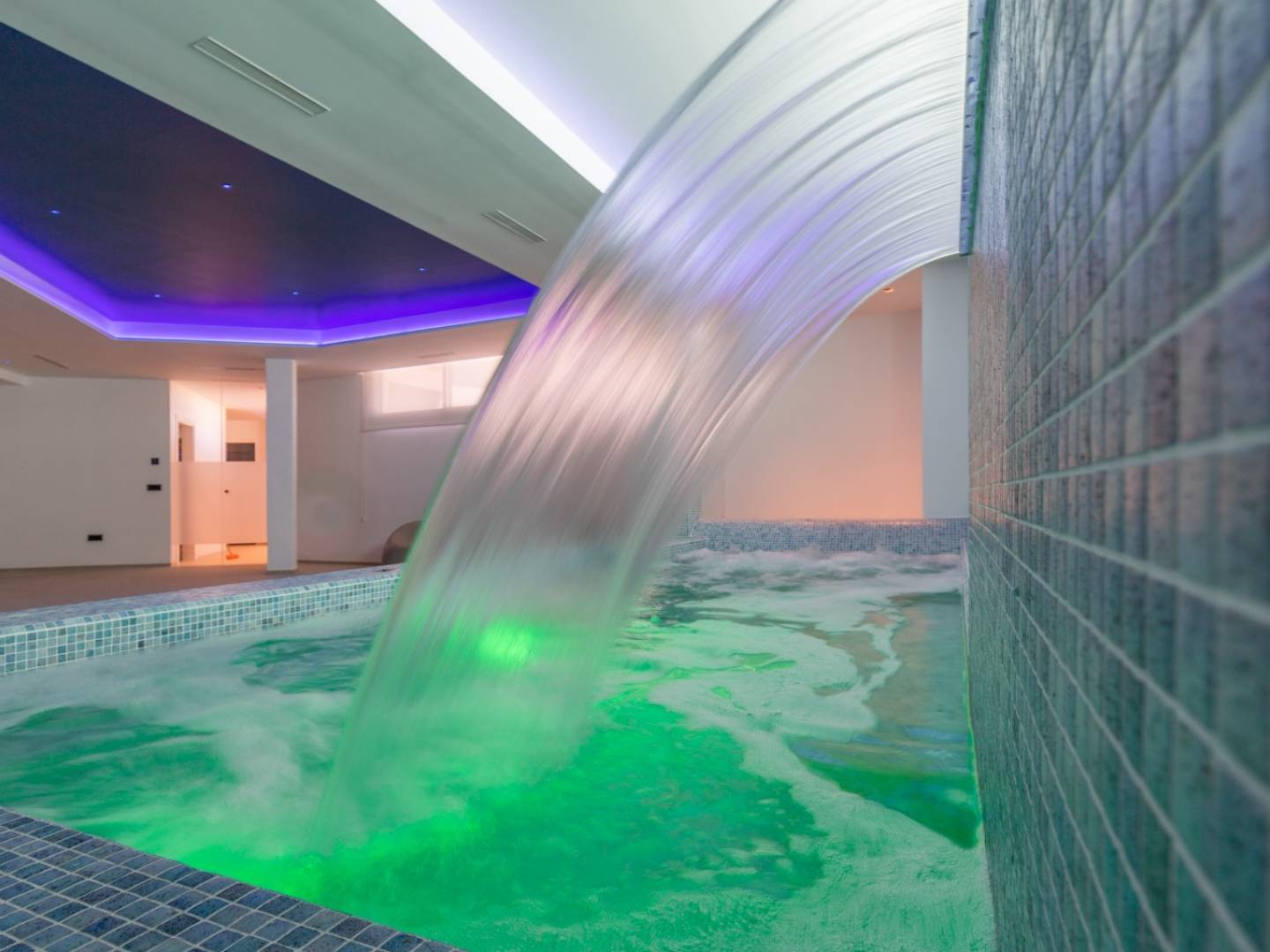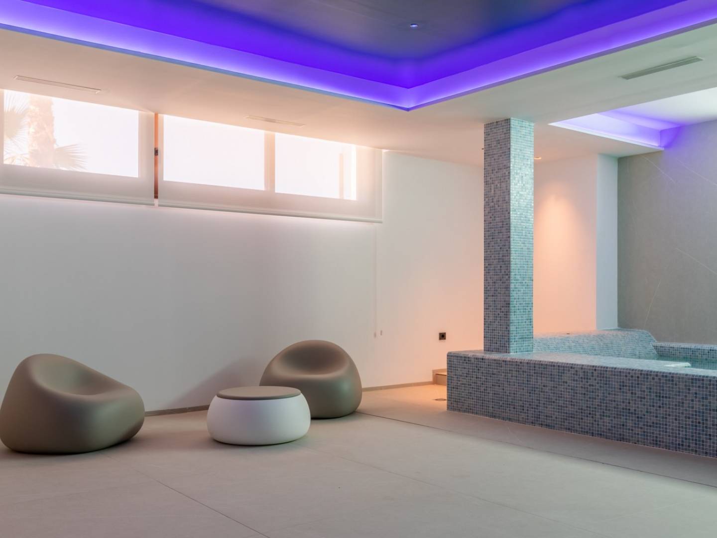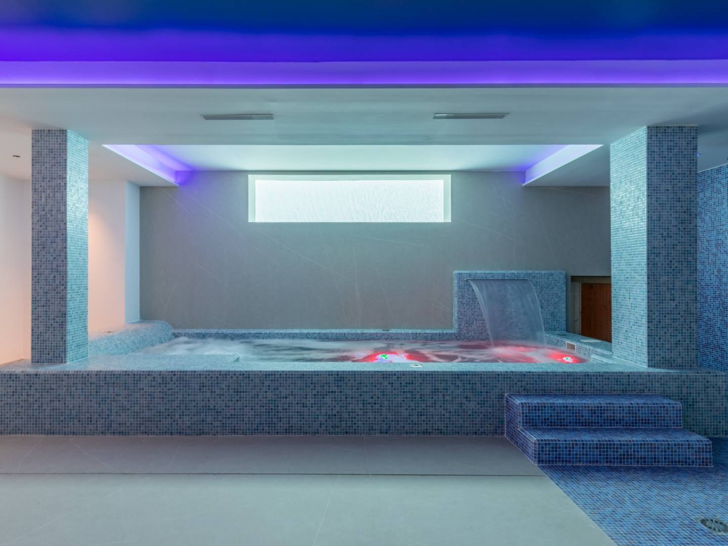 In der unteren Etage befindet sich ein großer Spa , das Herzstück der Villa. Ein kompletter Entspannungs- und Wellnessbereich mit einem beheizten Jacuzzi-Schwimmbecken mit Wasserfall, Hydromassage-Bänken und Sprudelliegen sowie einer großen finnischen Sauna und einem türkischen Bad. Außerdem gibt es einen großen Weinkeller und einen Aufzug mit Haltestelle auf jeder Ebene.