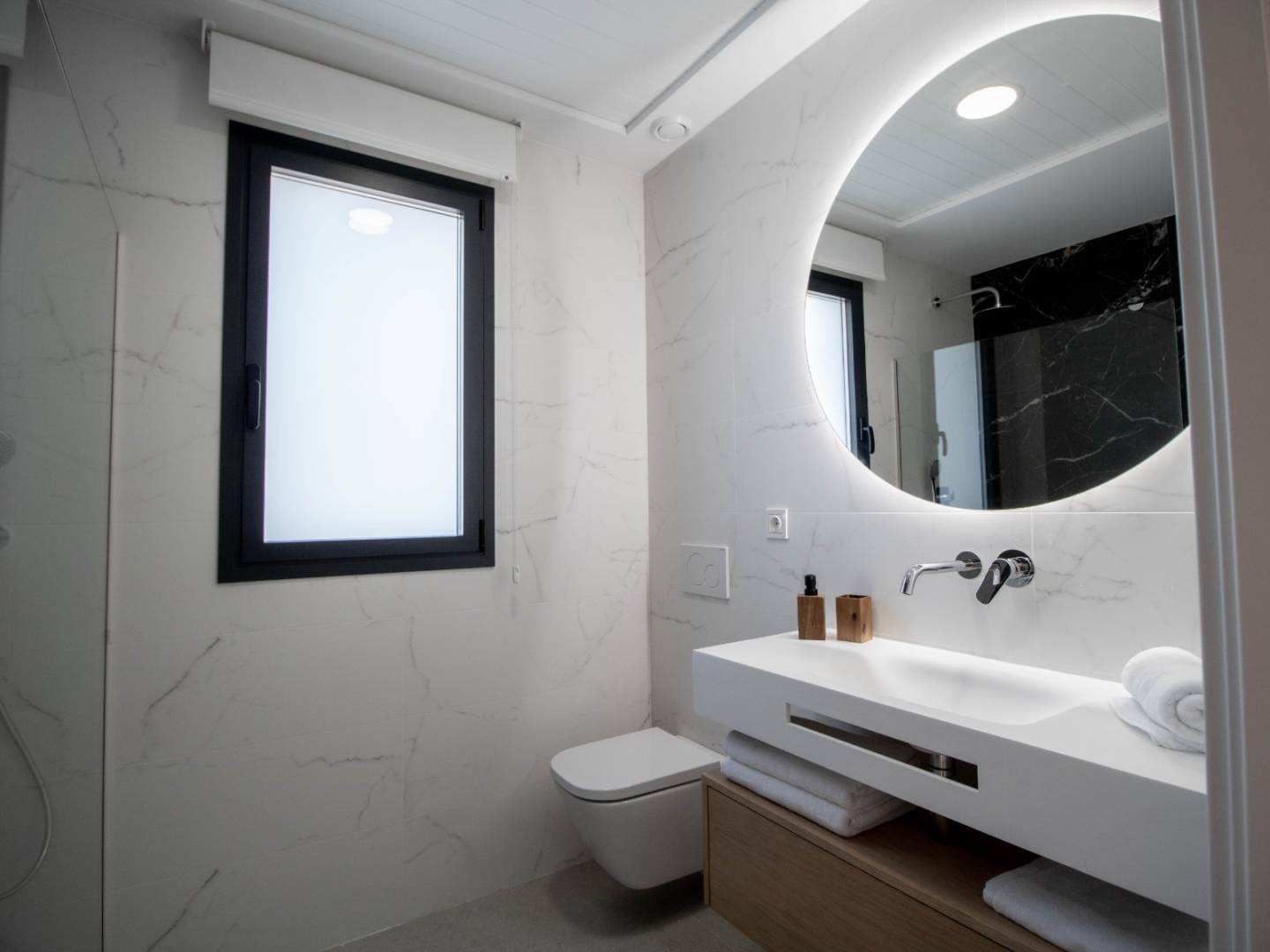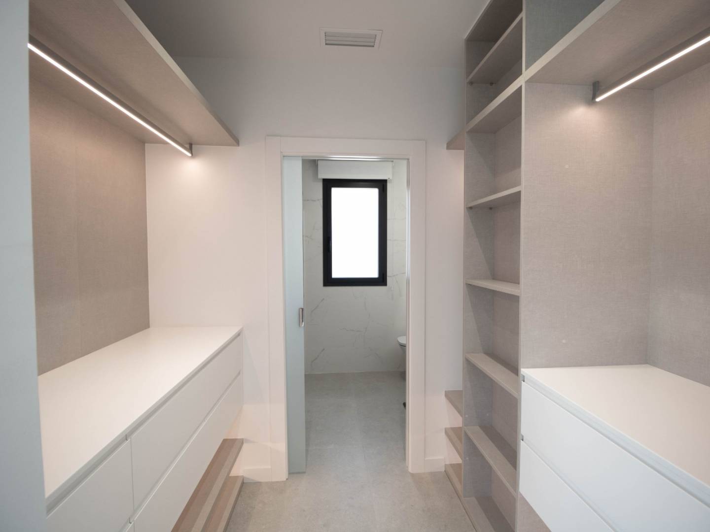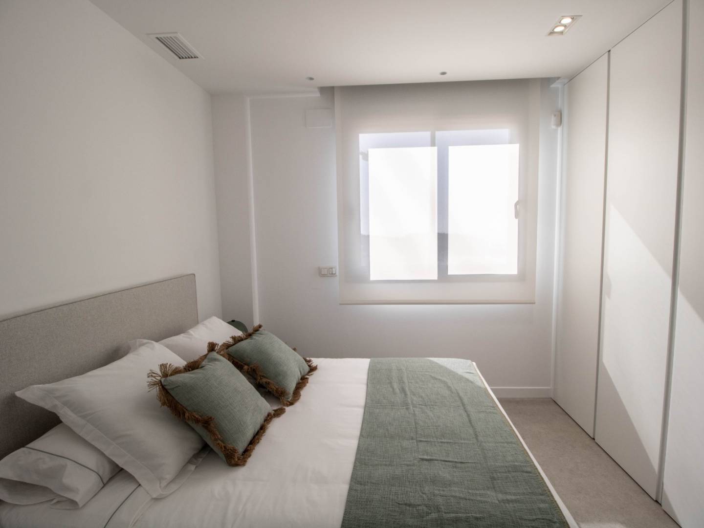 Das Hauptschlafzimmer in der obersten Etage ist eine Suite mit Ankleidezimmer, eigenem Bad und direktem Zugang zum Solarium und bietet Ihnen einen privaten und exklusiven Raum zum Entspannen und Genießen des Panoramablicks. Außerdem finden Sie im Obergeschoss eine zweite Suite mit Einbauschrank und eigenem Bad sowie im Erdgeschoss ein Doppelzimmer mit Einbauschrank.