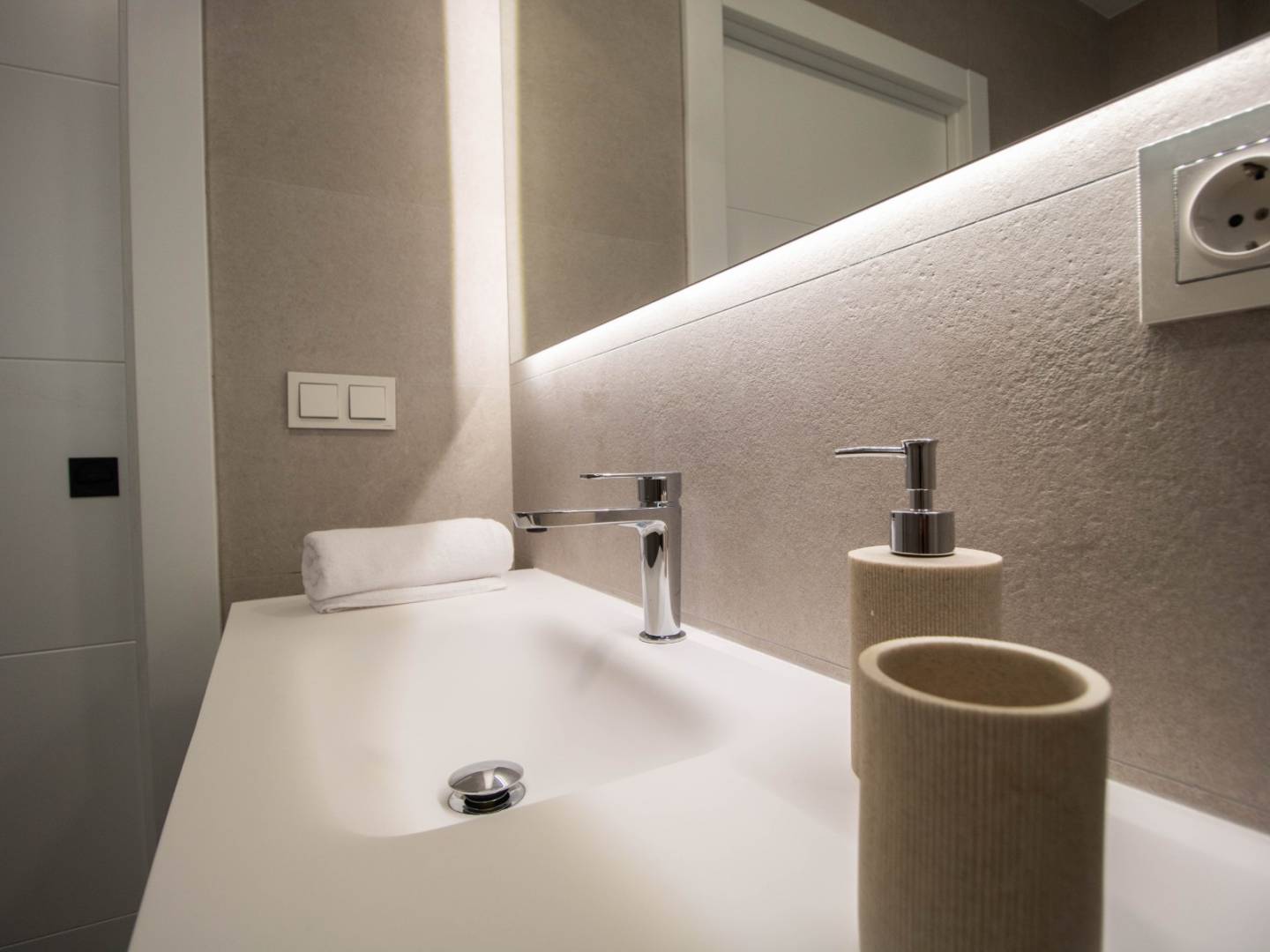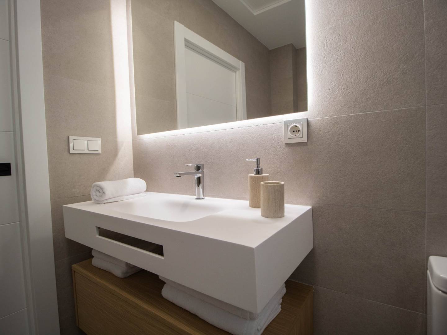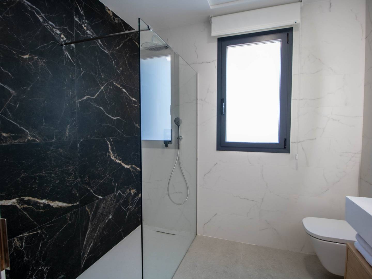 Das Hauptschlafzimmer in der obersten Etage ist eine Suite mit Ankleidezimmer, eigenem Bad und direktem Zugang zum Solarium und bietet Ihnen einen privaten und exklusiven Raum zum Entspannen und Genießen des Panoramablicks. Außerdem finden Sie im Obergeschoss eine zweite Suite mit Einbauschrank und eigenem Bad sowie im Erdgeschoss ein Doppelzimmer mit Einbauschrank.