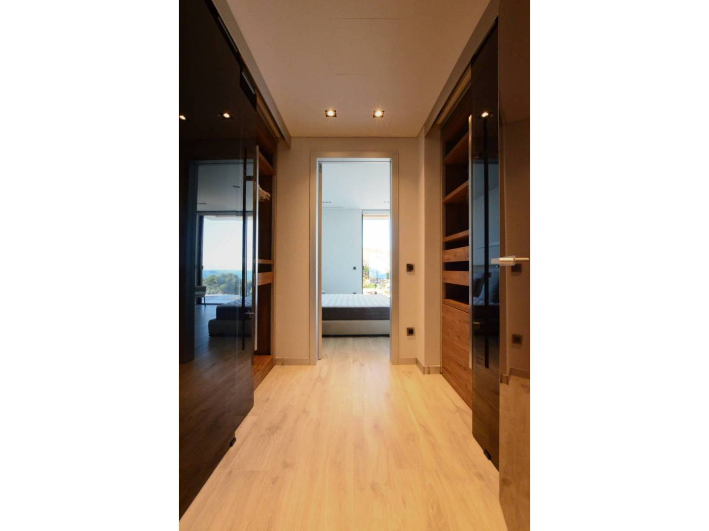 Wenn wir das Haus im dritten Stock betreten, finden wir einen großen Flur und drei Schlafzimmer. Das Hauptschlafzimmer bietet ein Ankleidezimmer , ein Badezimmer und eine große Eckterrasse mit Panoramablick auf das Meer . Das zweite Schlafzimmer verfügt über einen Einbauschrank , ein Badezimmer und eine private Terrasse mit Meerblick, während das dritte Schlafzimmer über einen Einbauschrank und ein Badezimmer verfügt. Wenn man die Treppe hinuntergeht, gelangt man auf die nächste Ebene, die ein Wohnzimmer mit Kamin , ein Esszimmer, eine offene Küche mit Kochinsel, ein Gästebad und eine Waschküche beherbergt. Alle diese Räume haben Zugang zu einer Terrasse mit Swimmingpool und Außendusche .