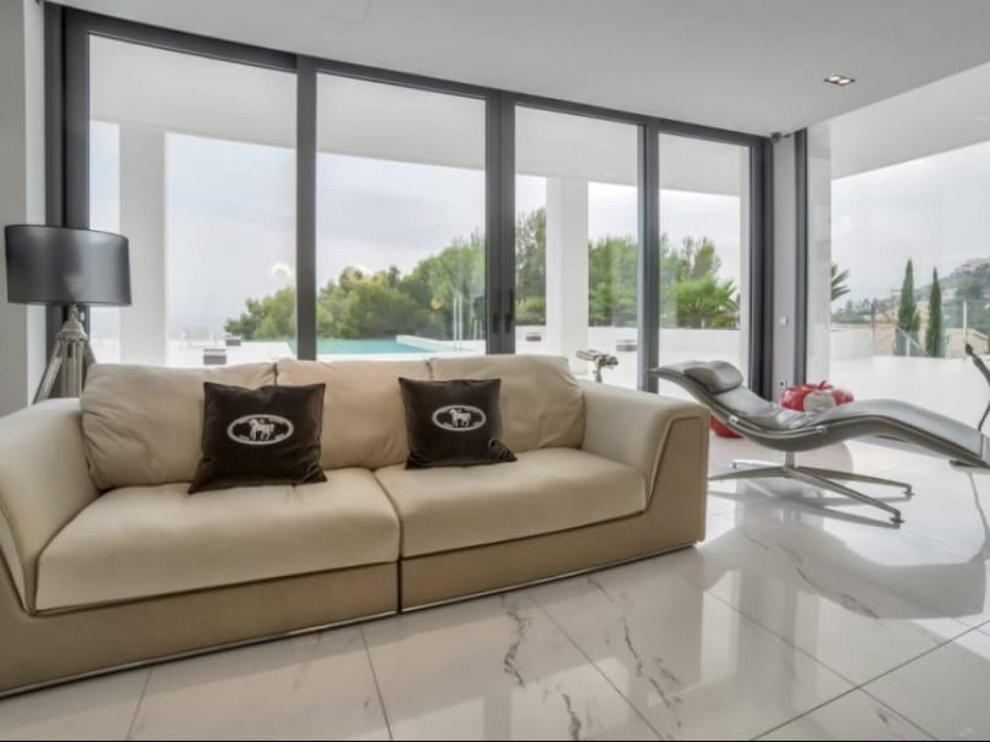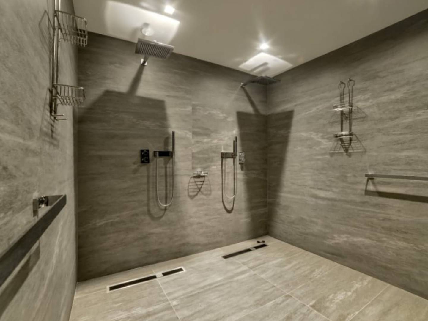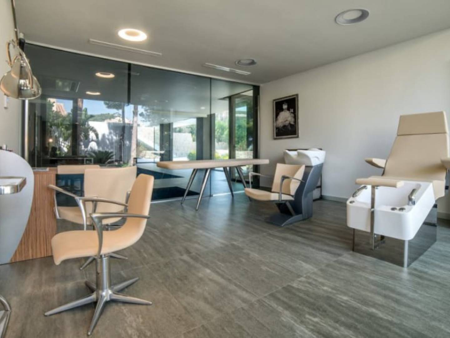 Im Erdgeschoss befindet sich ein Wellness-Refugium: ein großes Wohn-Esszimmer, eine Küche, ein Innenpool, ein Whirlpool, ein Fitnessstudio, ein Schönheitssalon mit Friseur, eine finnische und türkische Sauna, eine Doppeldusche und ein Weinkeller. Außerdem ein Service-Apartment und ein Raum für Gäste mit großen Schlafzimmern, Spielzimmer, Kino, Büro und Waschküche.