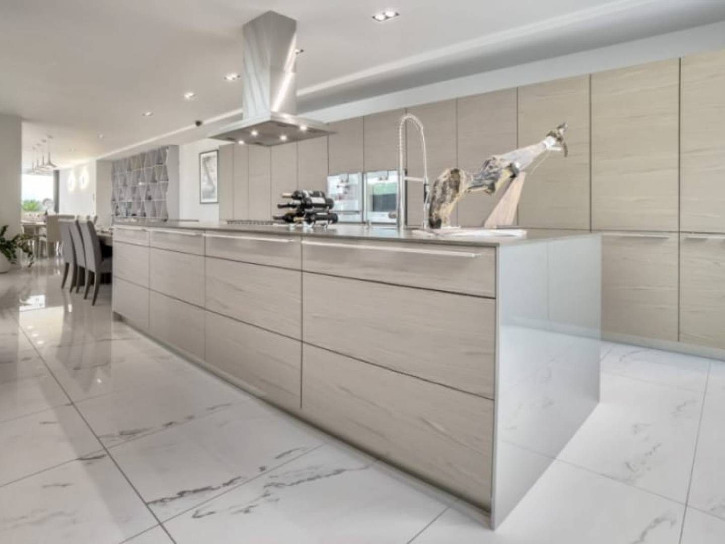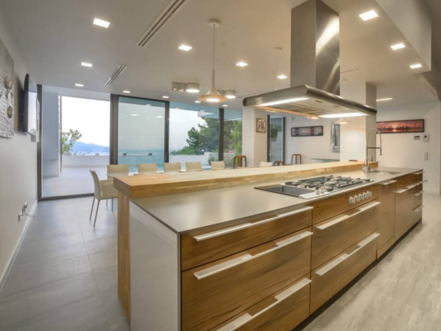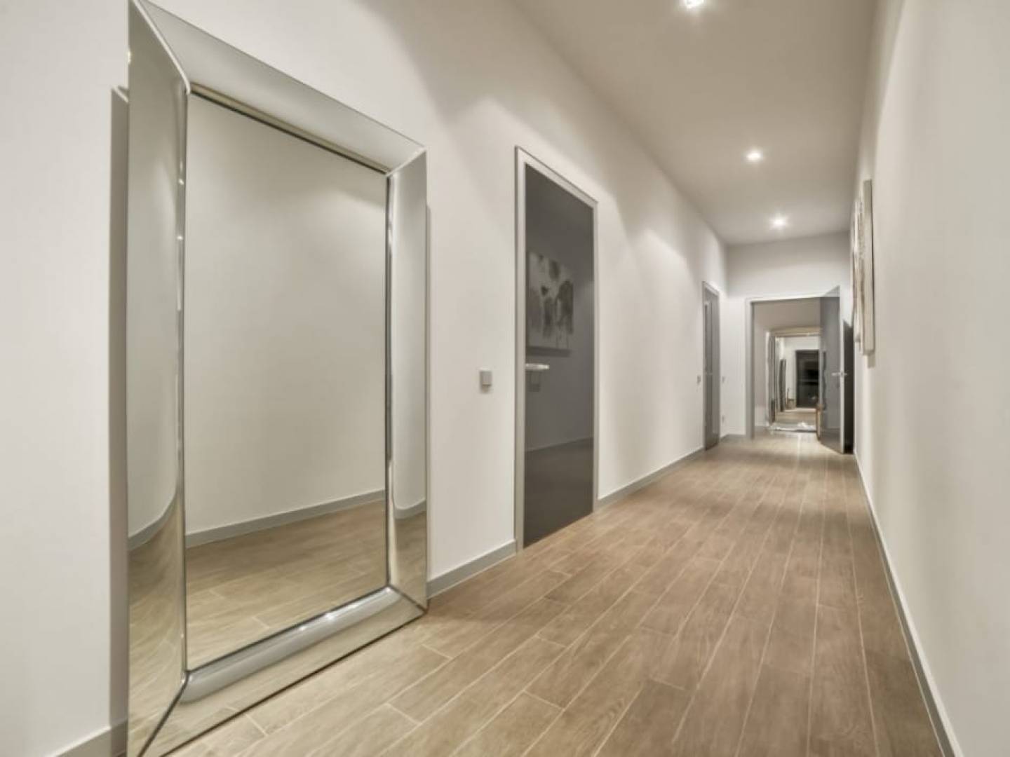 Im Erdgeschoss befindet sich ein Wellness-Refugium: ein großes Wohn-Esszimmer, eine Küche, ein Innenpool, ein Whirlpool, ein Fitnessstudio, ein Schönheitssalon mit Friseur, eine finnische und türkische Sauna, eine Doppeldusche und ein Weinkeller. Außerdem ein Service-Apartment und ein Raum für Gäste mit großen Schlafzimmern, Spielzimmer, Kino, Büro und Waschküche.