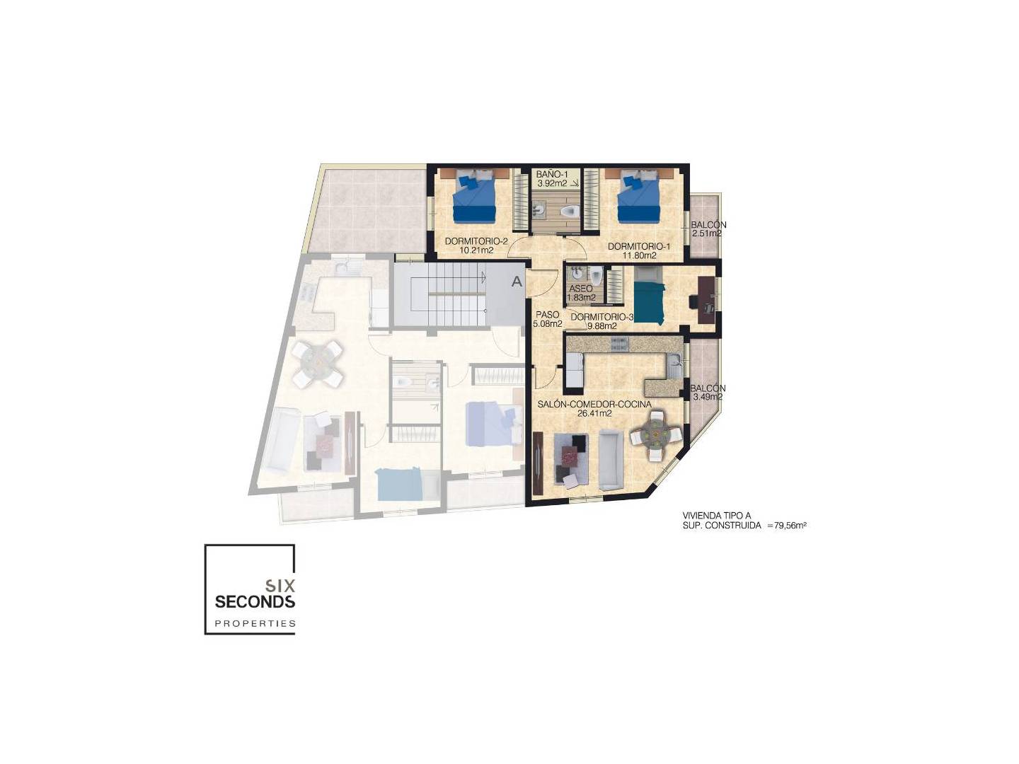 Häuser vom Typ A verfügen über 3 Schlafzimmer mit Einbauschränken, 1 komplettes Badezimmer, 1 WC, Außenbalkone und ein geräumiges und helles Wohn-Esszimmer mit offener Küche.