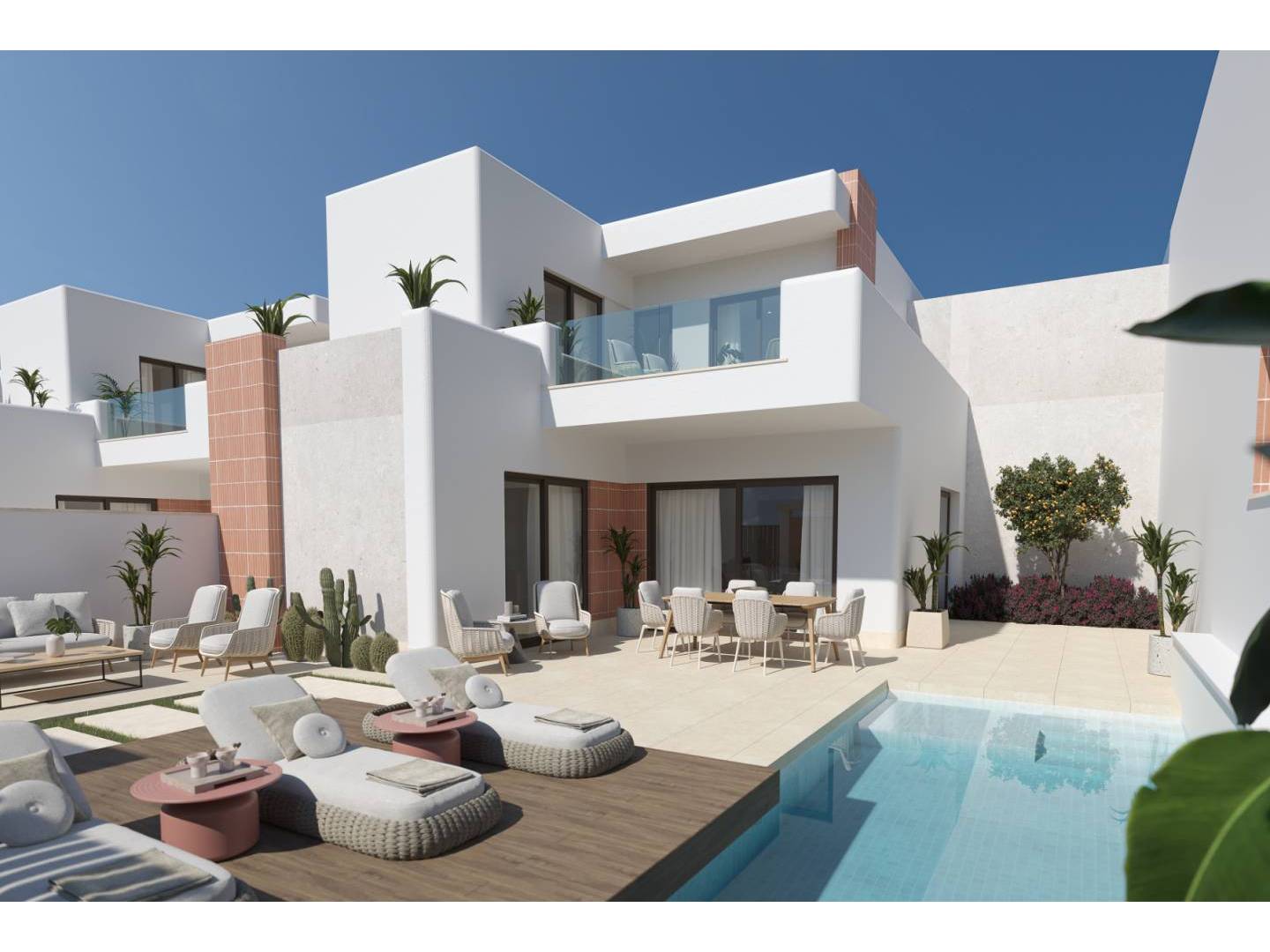 Die Unterkünfte werden in zwei verschiedenen Modellen angeboten, beide mit exklusiven Porcelanosa-Oberflächen auf den Böden, Fliesen, Badezimmern und der Küche. Zu den High-End-Geräten gehören ein Geschirrspüler, ein Kühlschrank mit Gefrierfach, eine Mikrowelle und ein Induktionskochfeld mit integrierter Dunstabzugshaube, alle von der Marke Balay. Duschen und Wasserhähne sind in elegantem Mattschwarz gehalten, ergänzt durch wandhängende Toiletten. Die Aufteilung ist sorgfältig gestaltet und umfasst eine Waschküche, eine Gästetoilette, große Terrassen und den Garten mit privatem Pool.