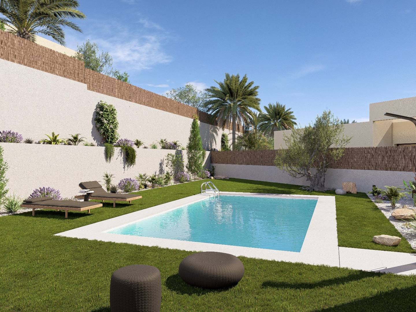 Der Außenbereich des Anwesens bietet eine wahre Oase der Ruhe. Genießen Sie Ihren eigenen privaten Swimmingpool, ideal zum Entspannen und Genießen des mediterranen Klimas in der Privatsphäre Ihres eigenen Zuhauses. Der sorgfältig gestaltete Garten mit Gras- und Kiesflächen schafft eine natürliche und einladende Atmosphäre, während das Tropfbewässerungssystem eine einfache und effiziente Pflege gewährleistet.