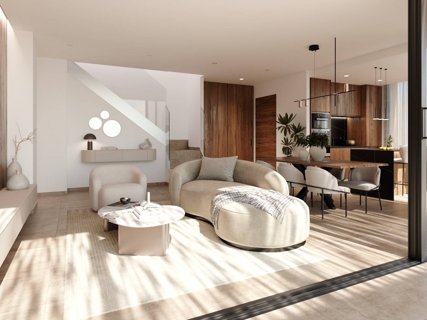 Das Erdgeschoss besteht aus einem Doppelzimmer mit eigenem Bad und privater Terrasse sowie einem offenen Wohn- und Essbereich, der mit geräumigen Terrassen und einer Pergola für Mahlzeiten im Freien verbunden ist. Im ersten Stock befinden sich drei Schlafzimmer, darunter die Master-Suite mit eigenem Bad und privater Terrasse, ideal zum Entspannen in einer ruhigen Umgebung.