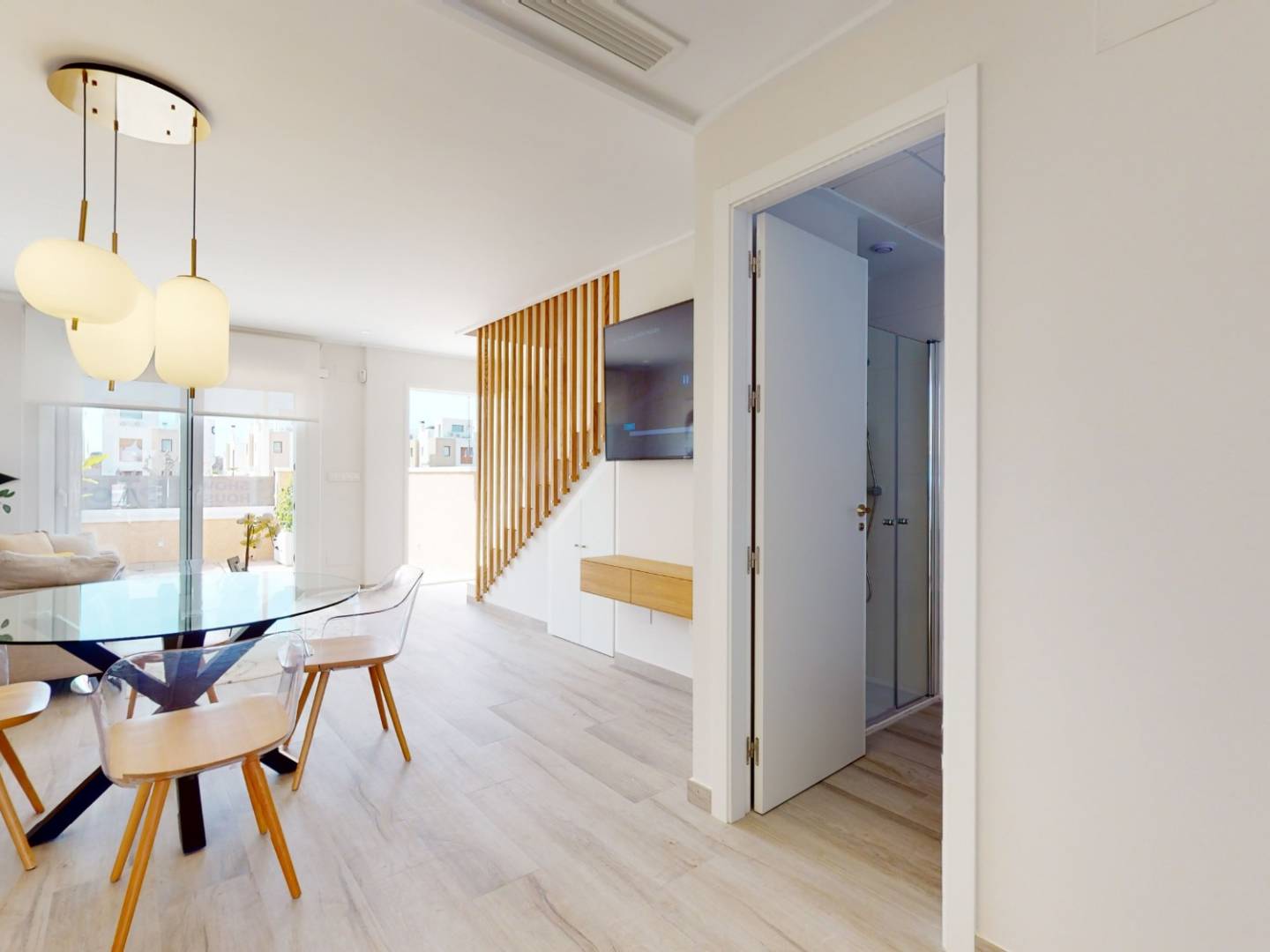 Hier präsentieren wir dieses elegante Maisonette-Stadthaus, ein Haus mit 3 hellen Schlafzimmern und 2 Badezimmern, die mit hochwertigen Materialien ausgestattet wurden, um maximalen Komfort zu bieten. Das Stadthaus erstreckt sich über eine Fläche von 81 m², ergänzt durch einen Garten von 33 m², eine private Terrasse von 16 m² und ein Solarium von 34 m², ideal, um das mediterrane Klima im Freien zu genießen.