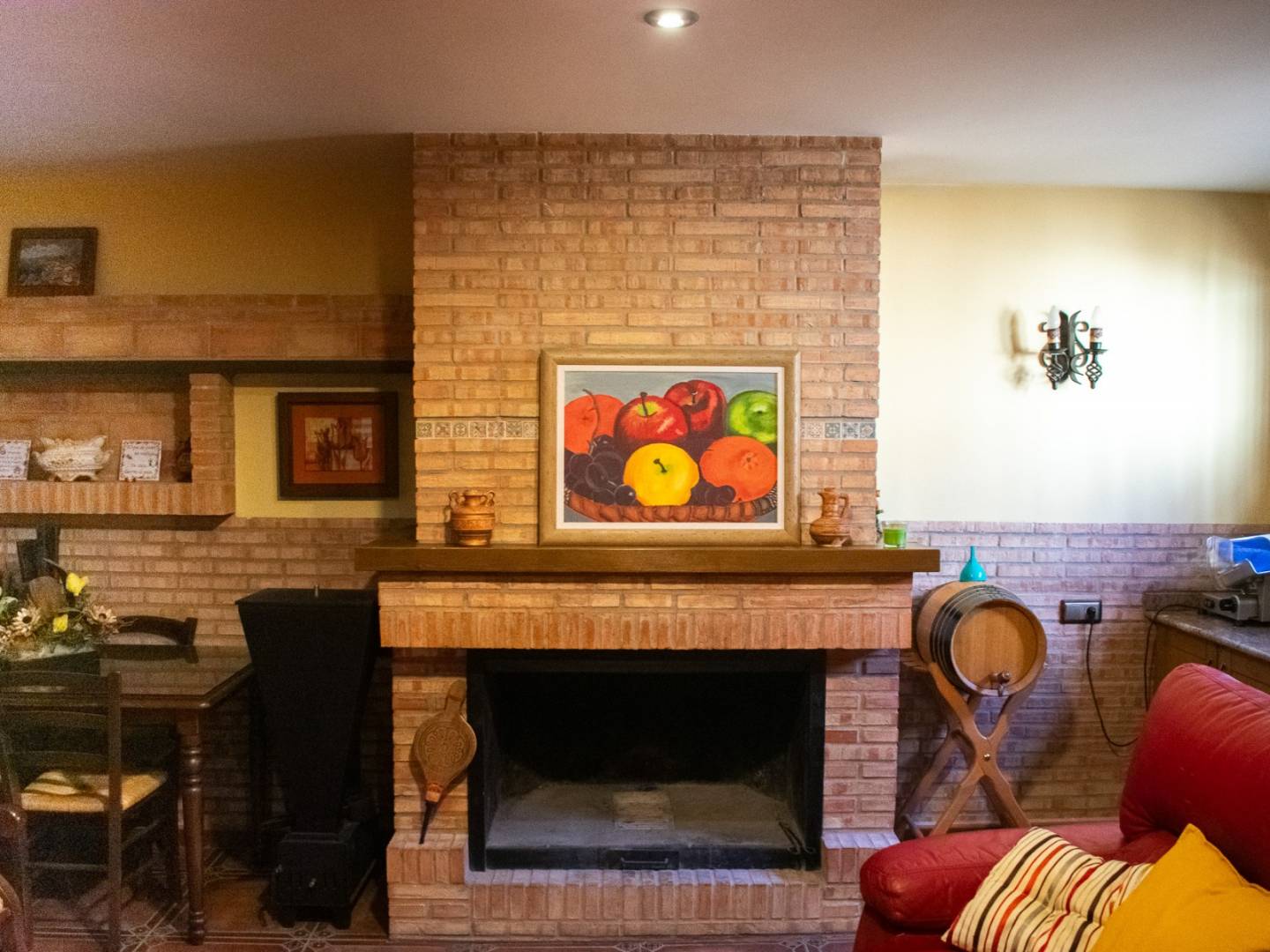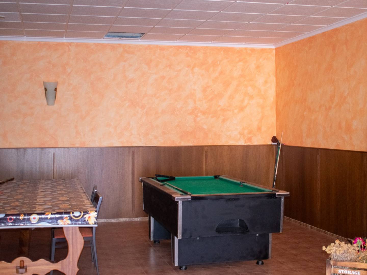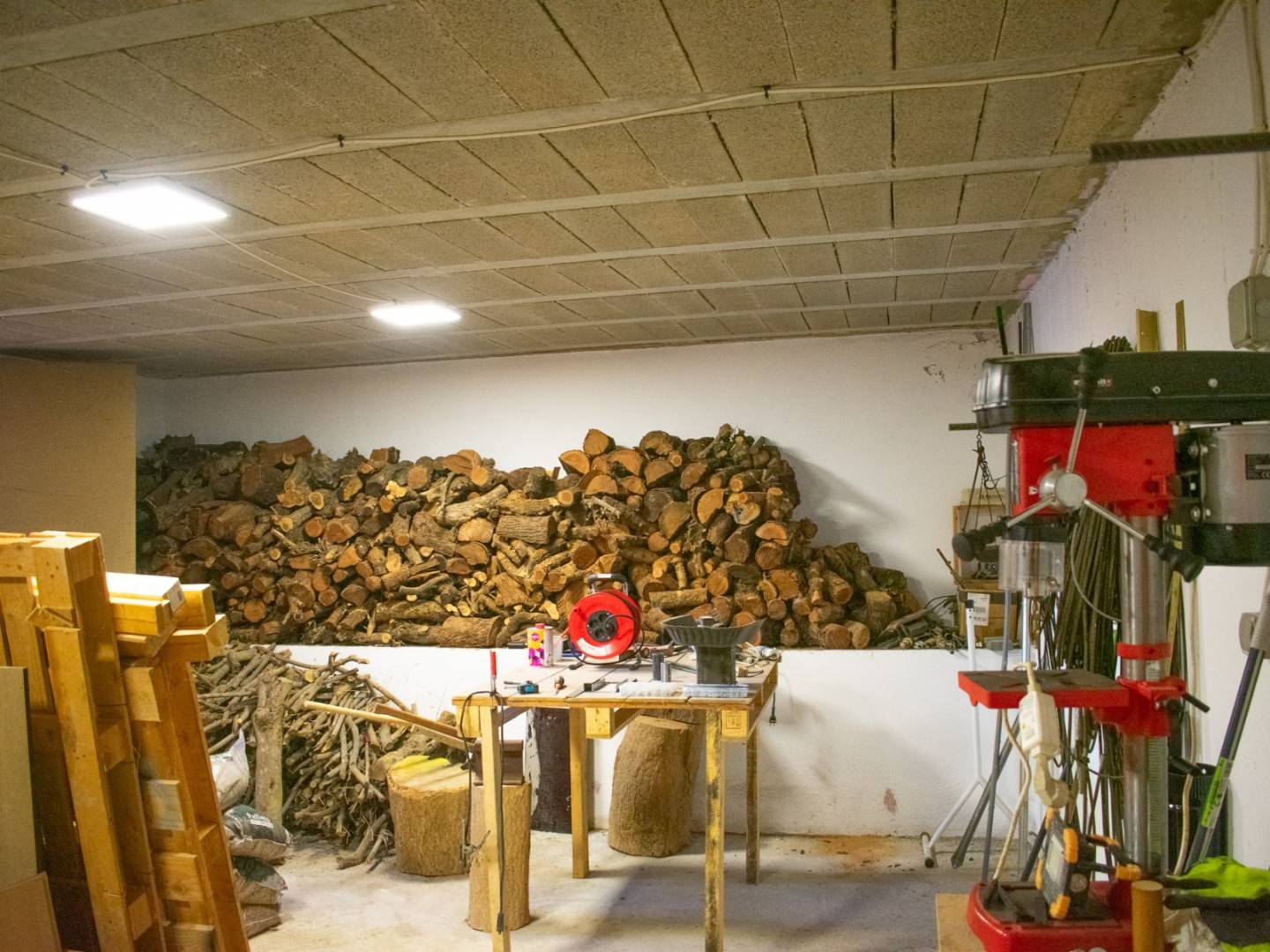 Im Untergeschoss verfügt das Haus über einen großen Wohnraum mit Küche und Kamin , der sich hervorragend für Besprechungen eignet. Außerdem gibt es einen Holzraum , einen Keller und einen Vorratsraum für Lebensmittel .