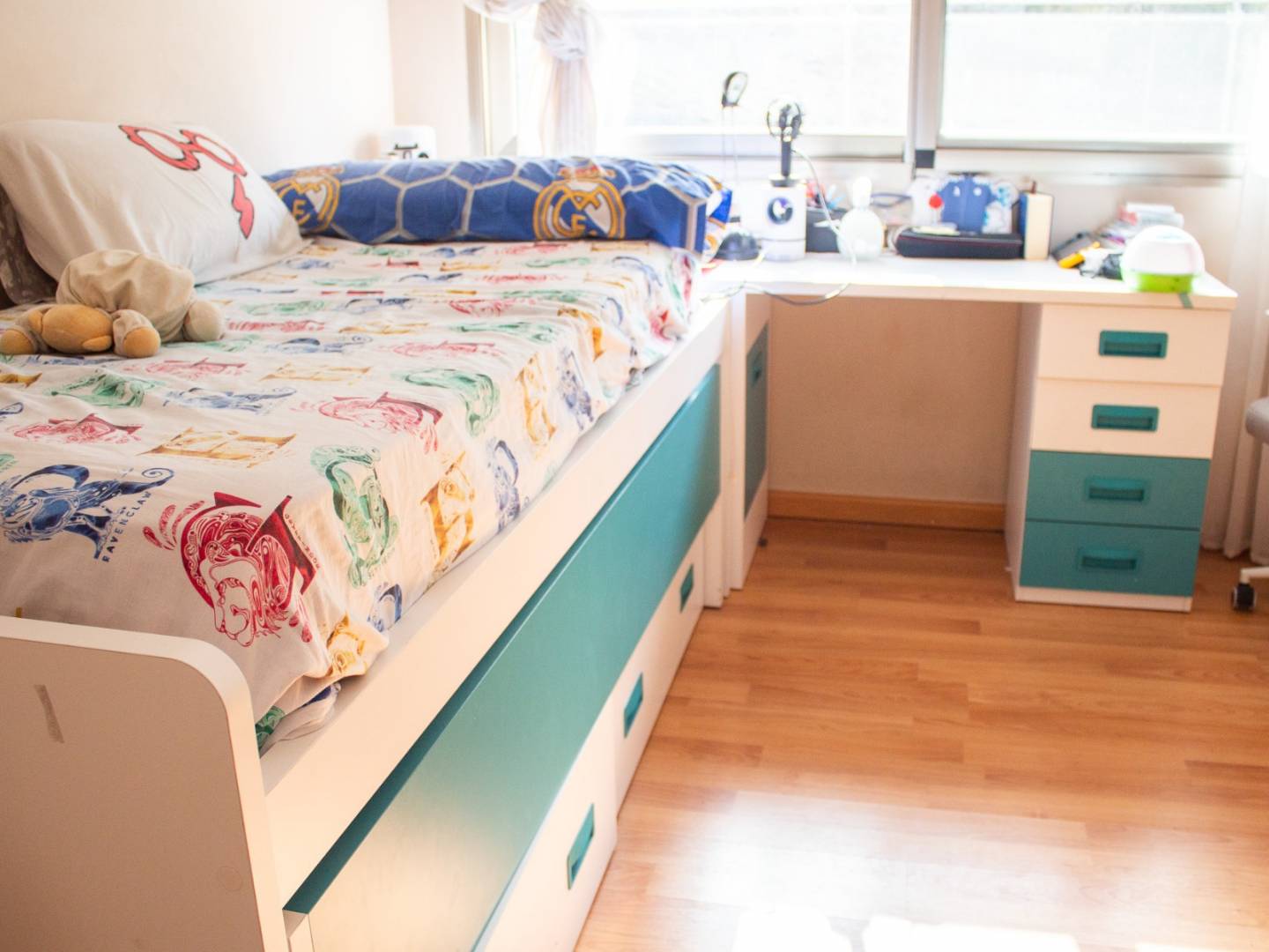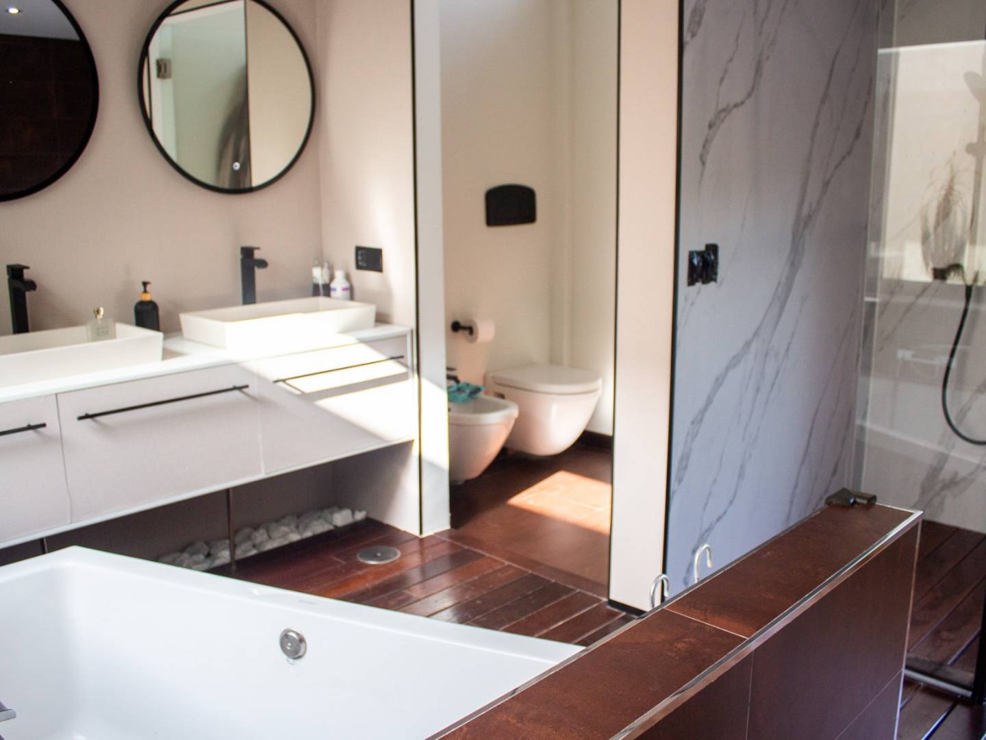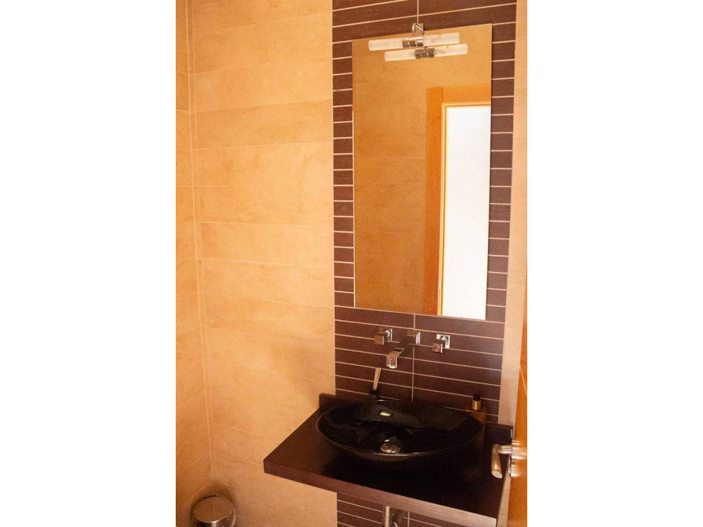 Das Haus verfügt über fünf Schlafzimmer , darunter eine Master-Suite mit Ankleidezimmer und offenem Badezimmer mit Badewanne , das sich zu einem eleganten, lichtdurchfluteten Innengarten mit üppiger Bepflanzung öffnet. Außerdem gibt es zwei weitere helle Schlafzimmer, ein Badezimmer und ein Gäste-WC. Insgesamt verfügt das Anwesen über drei Badezimmer und Gäste-WCs , verteilt auf die verschiedenen Etagen.