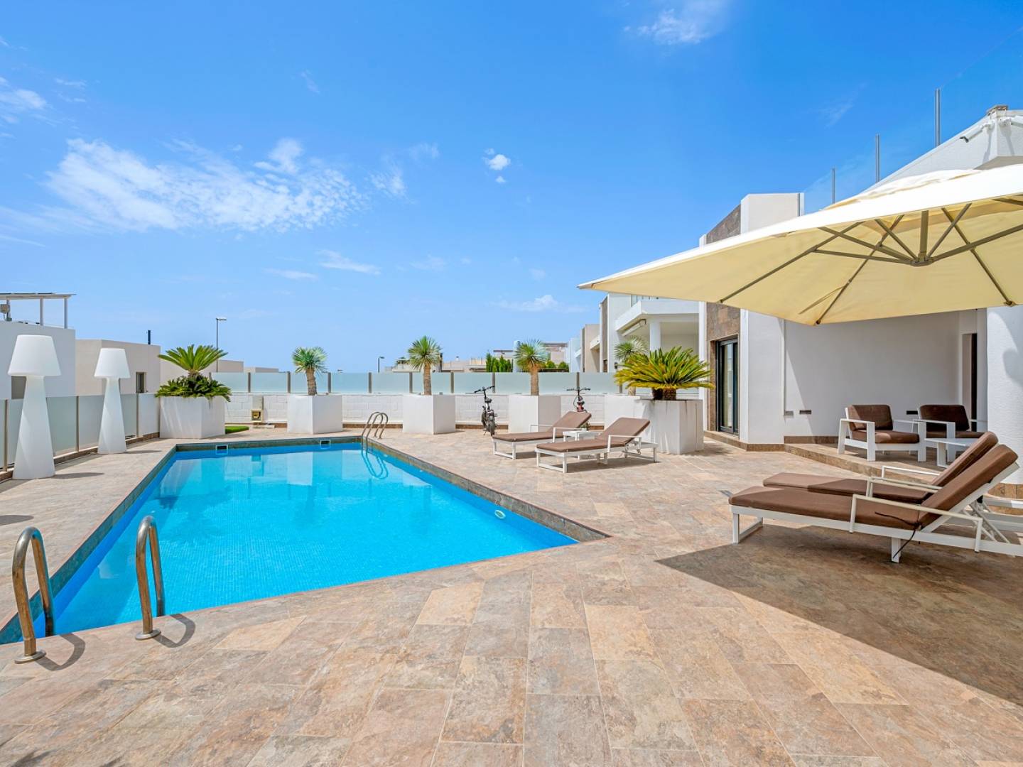 Diese moderne freistehende Villa wurde 2018 erbaut und befindet sich in Villamartín, Orihuela Costa. Mit einer bebauten Fläche von 113 m² auf einem großzügigen Grundstück von 464 m² bietet die Immobilie ein zeitgemäßes Design und eine durchdachte Raumaufteilung, ideal für das mediterrane Lebensgefühl. Die Südausrichtung sorgt den ganzen Tag über für reichlich Sonnenlicht und eine angenehme Atmosphäre. Die Villa verfügt über drei geräumige Schlafzimmer mit Einbauschränken und zwei voll ausgestattete Badezimmer, eines davon en suite im Hauptschlafzimmer. Die offene Küche ist in den Ess- und Wohnbereich integriert, der durch seine großen Fenster hell und freundlich ist, mit direktem Zugang zur Terrasse und zum privaten Pool. Ein separater Hauswirtschaftsraum ergänzt das Raumangebot. Der Außenbereich beeindruckt mit einem privaten Pool, pflegeleichten Gartenflächen, einer überdachten Terrasse für Mahlzeiten im Freien sowie einem Pergolabereich mit Kunstrasen. Auf dem Dach befindet sich eine große Sonnenterrasse. Es gibt einen eigenen Parkplatz auf dem Grundstück, inklusive überdachtem Carport. Zu den Extras zählen zentrale Klimaanlage, Solarpaneele, hochwertige Materialien und ein durchdachtes Raumkonzept. Die Villa befindet sich in einer ruhigen Wohngegend, in der Nähe von Golfplätzen, dem Einkaufszentrum Zenia Boulevard und den besten Stränden der Orihuela Costa. Ideal sowohl als dauerhafter Wohnsitz als auch als sichere Investition in einer der gefragtesten Regionen der Costa Blanca.