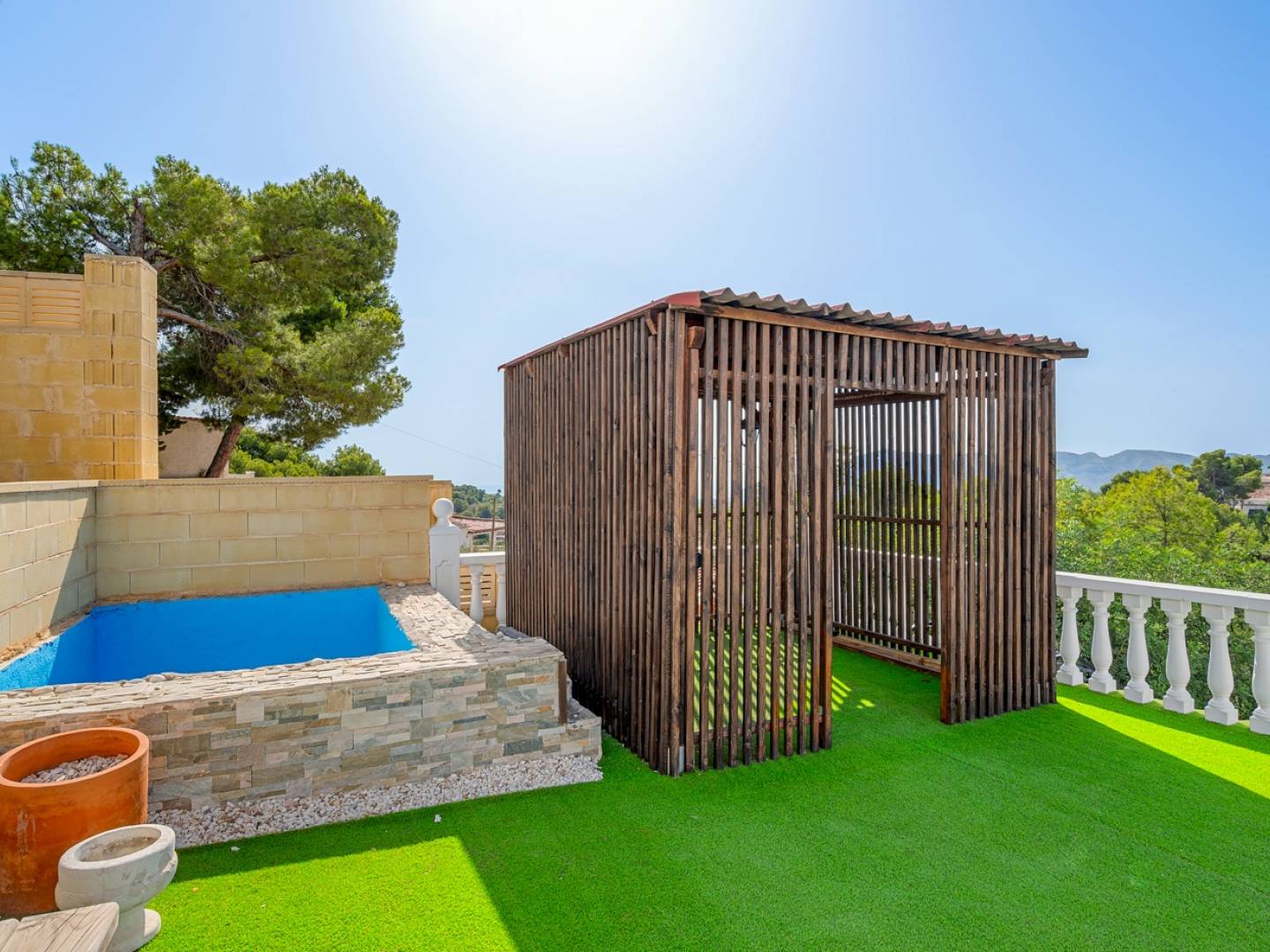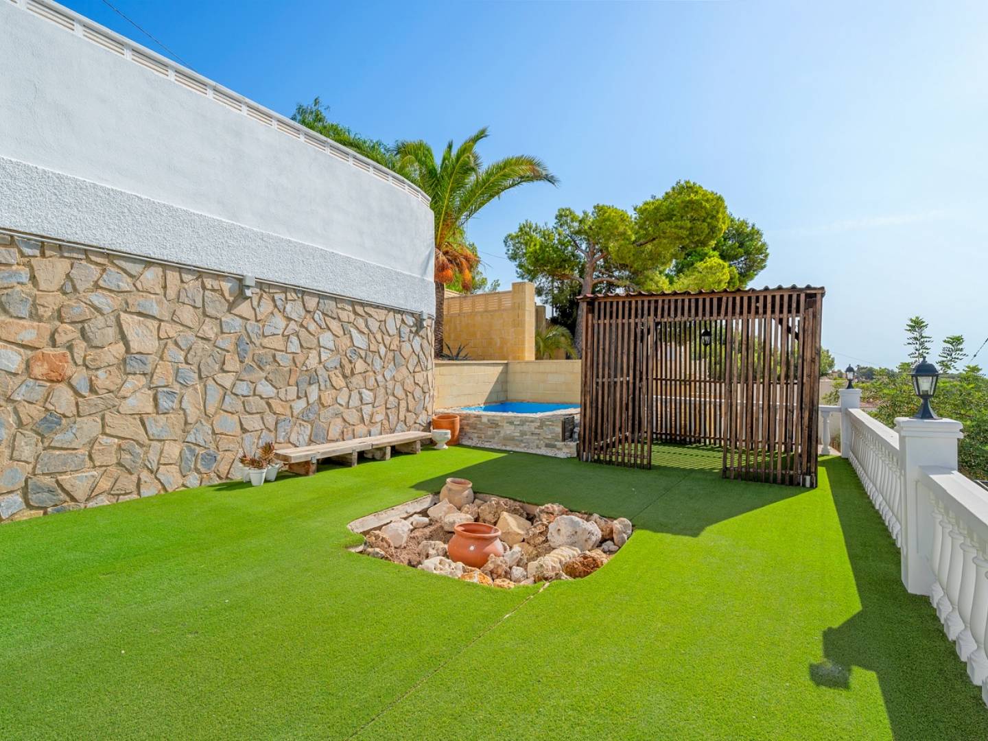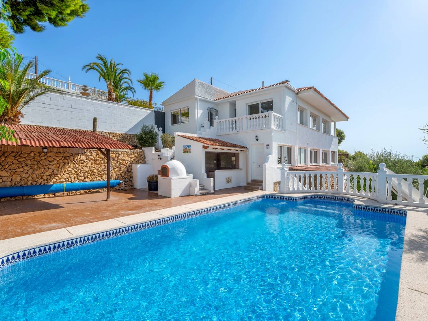 Im Erdgeschoss befinden sich vier Doppelschlafzimmer, zwei davon mit direktem Zugang zum Garten, sowie zwei Badezimmer und ein großzügiger Ruhebereich. Von hier aus gelangen Sie zum 36 m² großen Privatpool, der von einer eleganten Sonnenterrasse, einer überdachten Bar, einem Pizzaofen und einer Holzveranda umgeben ist. All dies wurde entwickelt, um das privilegierte Klima der Costa Blanca optimal zu nutzen.