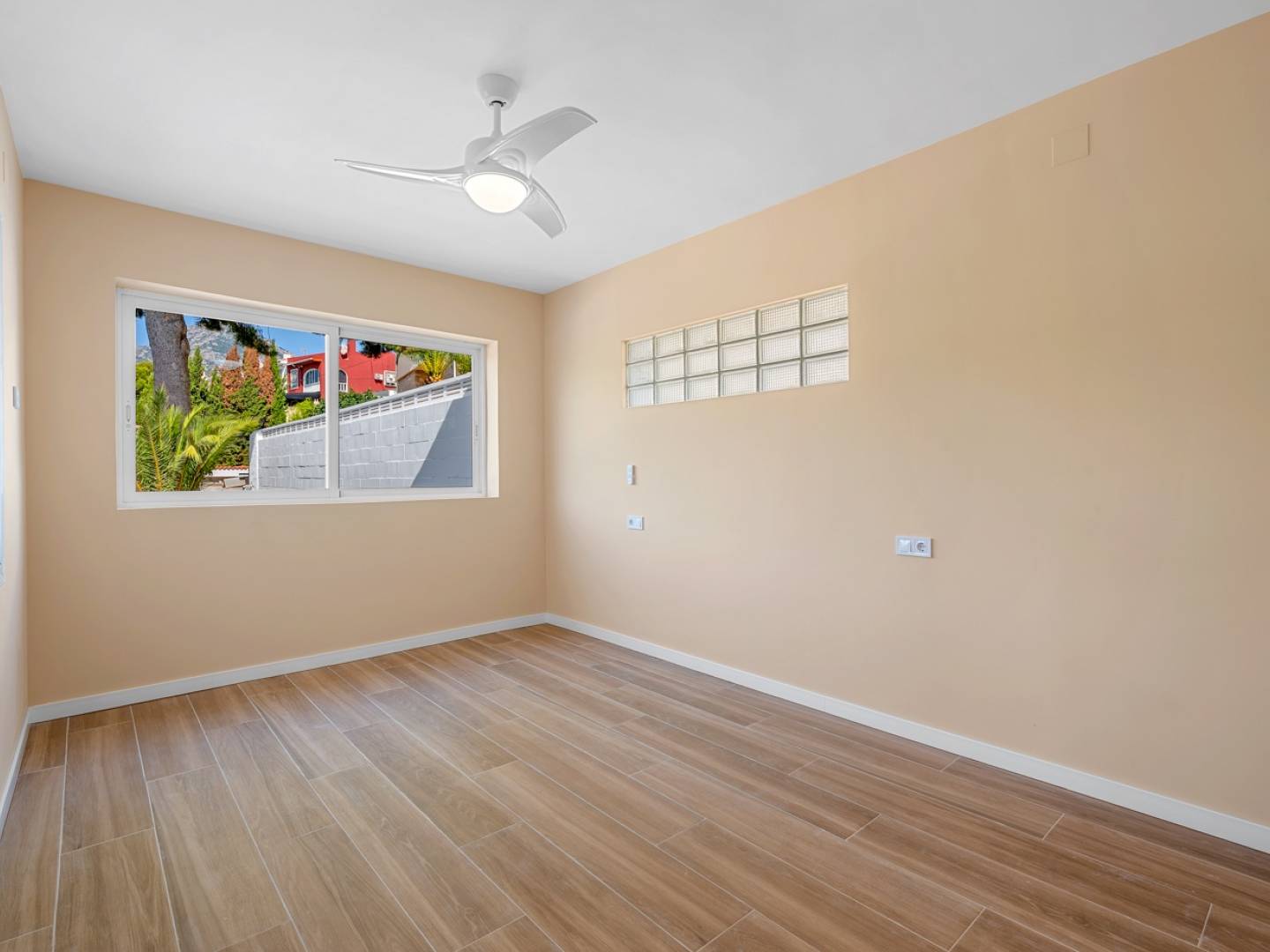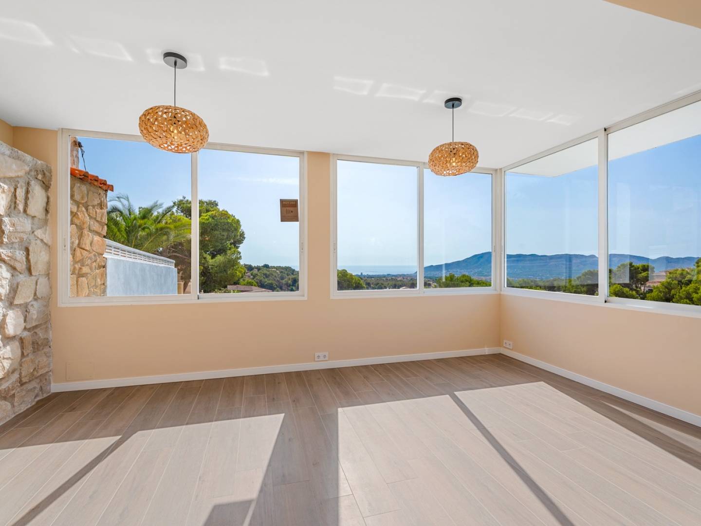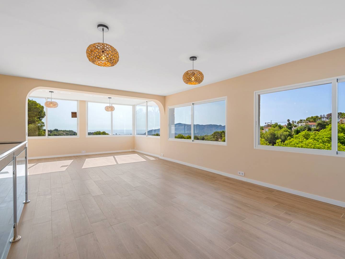 Im Erdgeschoss befinden sich vier Doppelschlafzimmer, zwei davon mit direktem Zugang zum Garten, sowie zwei Badezimmer und ein großzügiger Ruhebereich. Von hier aus gelangen Sie zum 36 m² großen Privatpool, der von einer eleganten Sonnenterrasse, einer überdachten Bar, einem Pizzaofen und einer Holzveranda umgeben ist. All dies wurde entwickelt, um das privilegierte Klima der Costa Blanca optimal zu nutzen.