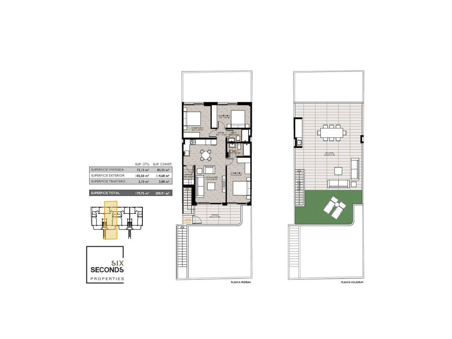 Die Penthäuser verfügen über eine 11 m² große Terrasse an der Vorderseite und ein spektakuläres 86 m² großes privates Dachsolarium , das sich ideal zum Sonnenbaden , zum Empfangen von Gästen oder zum Genießen des Panoramablicks eignet.