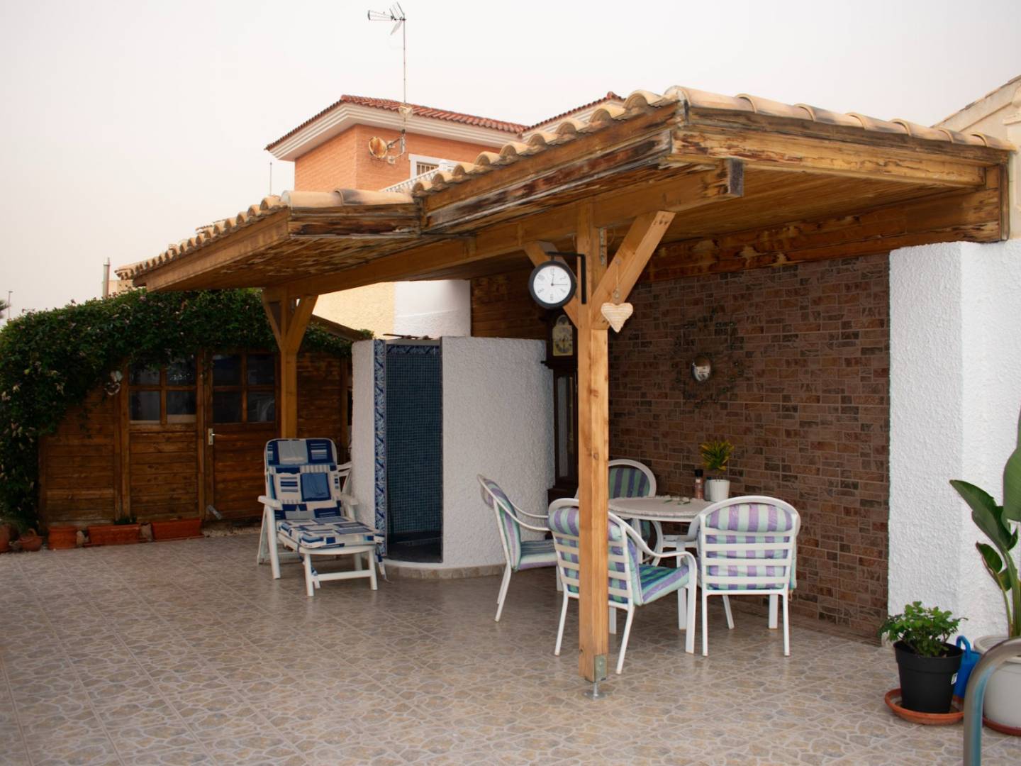 Der Außenbereich ist eines der größten Pluspunkte dieser Immobilie: ein großer privater Swimmingpool , eine Außendusche , ein weitläufiger Garten mit Terrasse, ein separates Gartenhaus und ein separater Abstellraum , der sich ideal als zusätzlicher Stauraum oder Werkstatt eignet. Die private Garage bietet Platz für ein Auto, und auf dem Grundstück lässt sich problemlos ein zweites Fahrzeug parken.