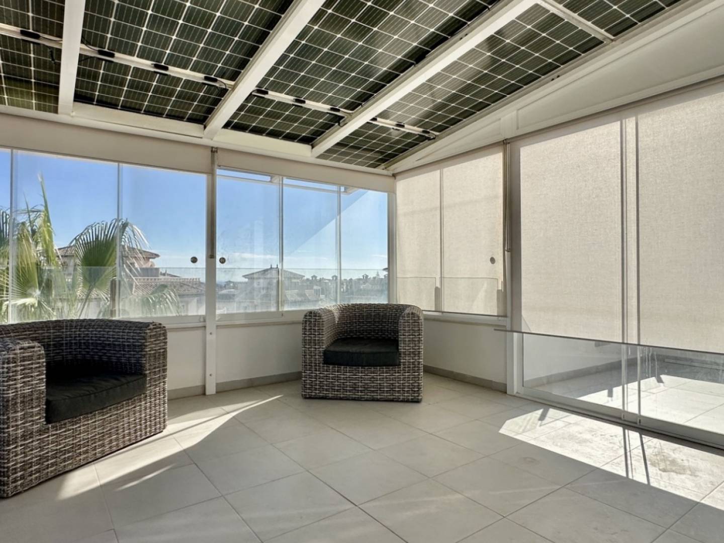 Entdecken Sie diese traumhafte Doppelhaushälfte in der exklusiven Gegend Lomas de Cabo Roig / Los Dolses (Orihuela Costa) . Das 2016 erbaute Haus bietet 125 m² Wohnfläche auf drei Ebenen auf einem 230 m² großen Privatgrundstück und vereint Eleganz, Komfort und Privatsphäre. Im Erdgeschoss schaffen ein helles Wohnzimmer mit Fußbodenheizung , eine voll ausgestattete Küche und ein Schlafzimmer mit Bad en suite ein ideales Wohnambiente. Im Obergeschoss öffnen sich zwei geräumige Schlafzimmer mit jeweils eigenem Bad zu einer verglasten Terrasse mit Meerblick – perfekt, um das mediterrane Klima das ganze Jahr über zu genießen. Zum Anwesen gehören außerdem ein privater Swimmingpool , eine Terrasse, die sich ideal für gesellige Abende und Grillpartys eignet , sowie ein privater, nach Osten und Westen ausgerichteter Garten , der zu jeder Jahreszeit optimales Tageslicht garantiert. Die Villa ist mit Klimaanlage , Fußbodenheizung , Einbauschränken , Speisekammer , Terrassen und Elektroheizung ausgestattet und befindet sich in einem tadellosen Zustand. Eine einzigartige Immobilie für alle, die Exklusivität, Komfort und Energieeffizienz in einer der begehrtesten Gegenden der Costa Blanca suchen.
