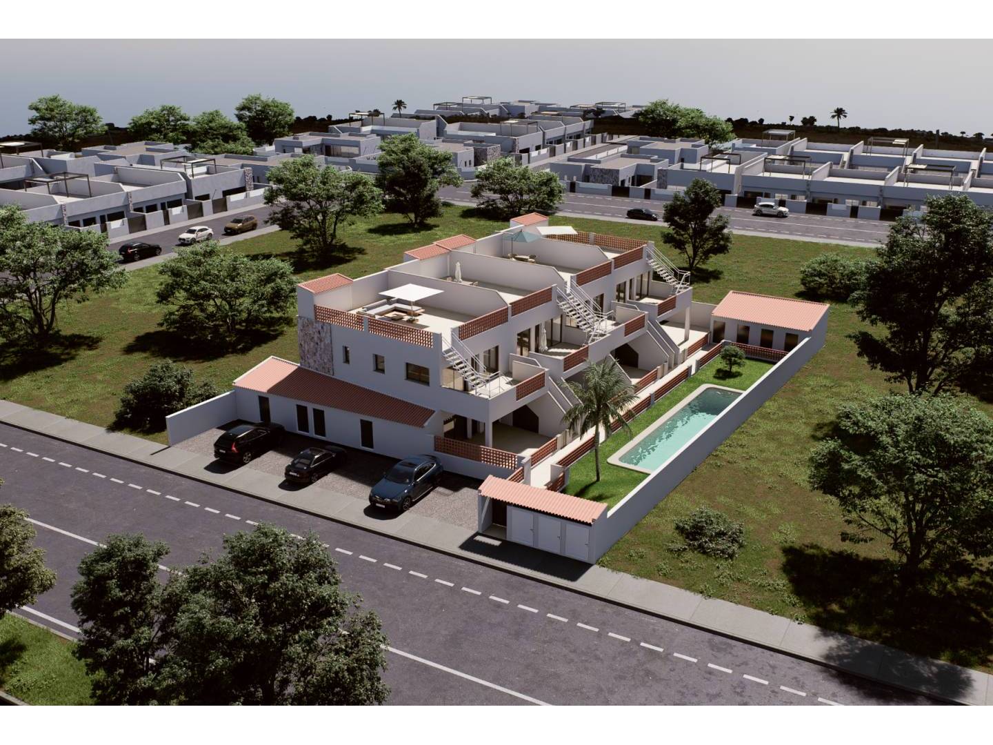 Entdecken Sie diese traumhafte Bungalowanlage in Pilar de la Horadada , einer erstklassigen Lage an der Costa Blanca, die Ruhe, Komfort und mediterranes Lebensgefühl vereint. Die Bungalows verfügen über drei Schlafzimmer und zwei Badezimmer , die für optimalen Komfort und maximale Funktionalität gestaltet sind. Die stilvolle, voll ausgestattete Küche ist in den hellen, offenen Wohn-/Essbereich integriert – ideal für gesellige Stunden mit Familie und Freunden. Eine Klimaanlage sorgt ganzjährig für angenehme Temperaturen und bietet Zugang zu einem gepflegten Gemeinschaftspool , der zum Entspannen in der Sonne einlädt. Die Bungalows im Erdgeschoss verfügen über einen privaten Garten und eine großzügige Terrasse , während die oberen Etagen mit einem außergewöhnlichen Solarium und einer weiteren Terrasse ausgestattet sind – perfekt, um das mediterrane Klima in vollen Zügen zu genießen. Dank der Nähe zum Meer , zu Golfplätzen und allen Annehmlichkeiten bietet dieser Bungalow eine hervorragende Gelegenheit, ob als Hauptwohnsitz, Zweitwohnsitz oder Kapitalanlage.