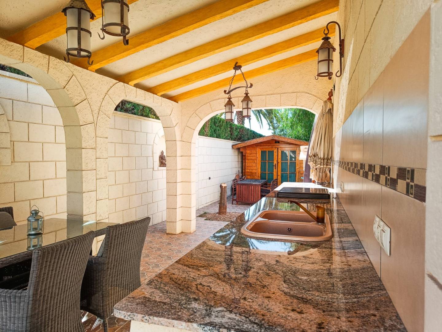 Im Außenbereich bietet das Anwesen mehrere Terrassen , eine Sommerküche , wunderschön angelegte Gärten und Obstbäume wie Feigen- und Pfirsichbäume , die eine angenehme und naturnahe Atmosphäre schaffen. Es verfügt außerdem über überdachte Parkplätze und einen beheizten Swimmingpool , der sich ideal für ganzjährigen Badespaß eignet.