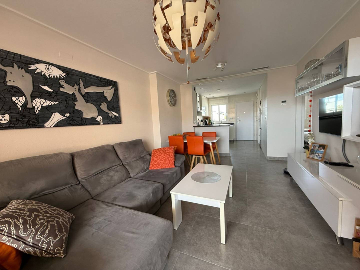 Entdecken Sie Ihr neues Zuhause in Villamartín Gelegen im charmanten Gebiet von Villamartín in der Stadt Orihuela, ist diese wunderbare Immobilie die perfekte Wahl für diejenigen, die einen modernen und einladenden Raum suchen. Mit einem zeitgenössischen und hellen Design bietet dieses Zuhause ein ideales Gleichgewicht zwischen Komfort und Funktionalität. Immobilienmerkmale Mit einer Baufläche von 75 m² verfügt die Wohnung über 2 warme und einladende Schlafzimmer sowie 2 moderne Badezimmer, die die Privatsphäre und den Komfort der Bewohner gewährleisten. Die offene Gestaltung der Küche ermöglicht einen komfortablen Lebensstil, ideal, um Zeit mit Freunden und Familie zu verbringen. Annehmlichkeiten und Ausstattungen Das Ambiente wird durch ein zentrales Klimaanlagensystem und Heizung ergänzt, die das ganze Jahr über ein angenehmes Klima gewährleisten. Die Immobilie wird vollständig möbliert und mit Details präsentiert, die die Funktionalität maximieren, einschließlich einer Sicherheitstür und Schallschutzverglasung für eine bessere akustische und thermische Isolierung. Außenbereich und Dienstleistungen Die Außenbereiche dieses Hauses bieten Momente der Entspannung und des Genusses, dank einer offenen Terrasse, die perfekt ist, um die sonnige Südseite zu genießen. Darüber hinaus profitieren Sie von einem gemeinschaftlichen Pool, der ein perfekter Ort ist, um sich an heißen Sommertagen abzukühlen. Zur größeren Bequemlichkeit gehört zur Immobilie auch ein Parkplatz und ein Abstellraum, die das Verstauen und Organisieren Ihrer Sachen erleichtern. Anbindung und Lage Dank ihrer ausgezeichneten Lage bietet diese Immobilie gute Verkehrsanbindungen zu den wichtigsten Verkehrswegen, was sie zu einer praktischen Wahl sowohl für diejenigen macht, die die lebhafte Küste von Alicante erkunden möchten, als auch für diejenigen, die die Ruhe des Lebens in Villamartín genießen möchten. Die Nähe zu wichtigen Dienstleistungen wie Geschäften, Restaurants und Freizeitzentren garantiert ein erfülltes und angenehmes Leben. Verpassen Sie nicht die Gelegenheit, dieses stilvolle und komfortable Zuhause in einem der begehrtesten Gebiete von Orihuela zu besichtigen. Kommen Sie und entdecken Sie alles, was diese Immobilie zu bieten hat!