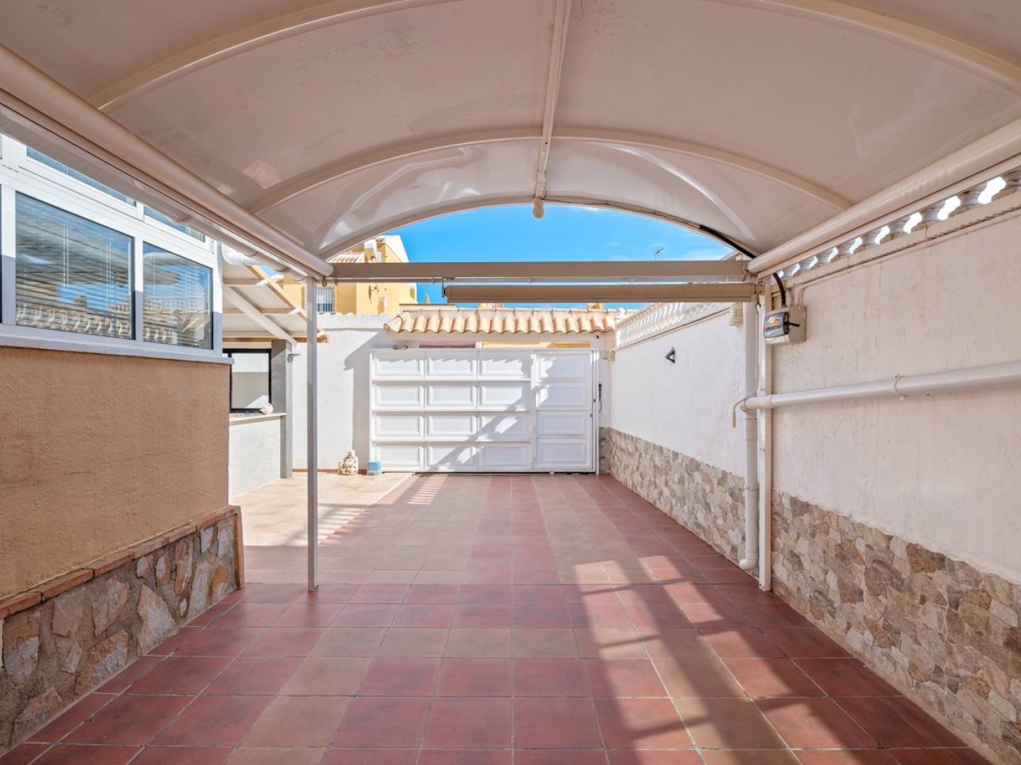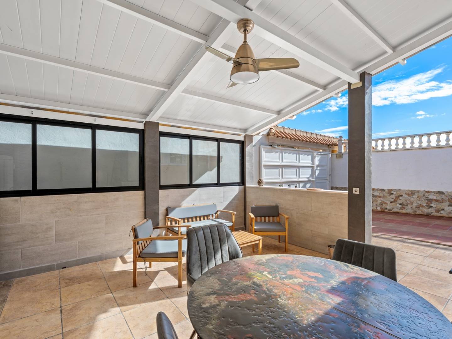Diese Doppelhaushälfte mit 5 Schlafzimmern bietet eine komfortable und funktionale Raumaufteilung auf zwei Etagen, mit Wintergarten und einem komplett renovierten Keller – ideal für alle, die viel Platz und Flexibilität suchen. Im Erdgeschoss führt ein geschlossener Wintergarten in ein helles Wohnzimmer , angrenzend an ein Schlafzimmer mit begehbarem Kleiderschrank , ein Badezimmer mit Dusche und eine separate, voll ausgestattete Küche . Das Obergeschoss umfasst drei Schlafzimmer , darunter ein Doppelzimmer mit eigener Terrasse , sowie zwei Einzelzimmer, die sich auch als Büro, Kinderzimmer oder Gästezimmer eignen. Von hier aus gelangt man in den privaten Wintergarten – ein idealer Ort zum Entspannen und Genießen des Klimas zu jeder Jahreszeit. Der Keller mit Wohnzimmer, Schlafzimmer und Badezimmer mit Dusche ist klimatisiert und belüftet und eignet sich daher hervorragend als Gästezimmer, separate Wohnung oder Freizeitbereich . Das Haus verfügt über doppelt verglaste Fenster , Deckenventilatoren und Klimaanlage in allen Räumen sowie einen Abstellraum . Das Anwesen bietet einen privaten Garten mit Sommer-/Winterküche , zwei Parkplätze und Zugang zu einem Gemeinschaftspool . Dieses bezugsfertige Haus eignet sich sowohl als Hauptwohnsitz als auch als Kapitalanlage .