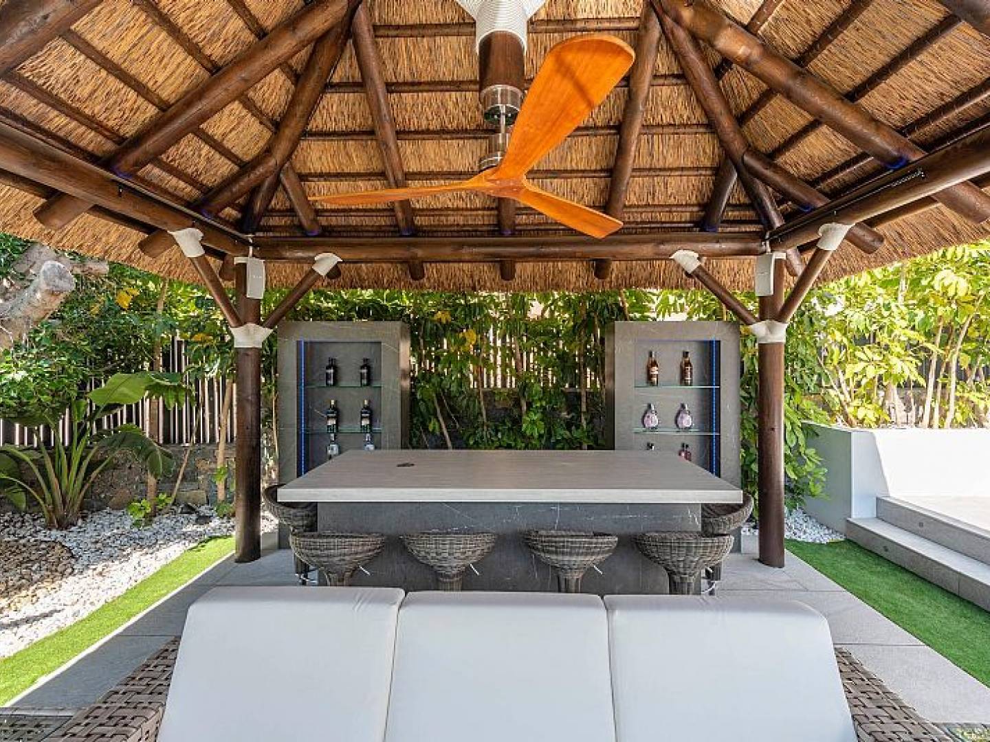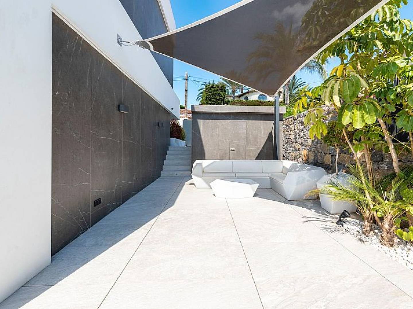 Der Außenbereich der Villa ist so gestaltet, dass er das mediterrane Klima optimal ausnutzt. Er verfügt über einen privaten Garten, der einen perfekten grünen Raum zum Entspannen oder für Outdoor-Aktivitäten bietet. Die Terrasse ist ein idealer Ort für Mahlzeiten im Freien oder einfach nur, um die Aussicht zu genießen. Darüber hinaus umfasst die Immobilie ein Solarium, das perfekt ist, um in Privatsphäre zu sonnenbaden. Der private Pool ist eine wahre Oase und bietet einen erfrischenden Ort zum Schwimmen und Entspannen an heißen Sommertagen.