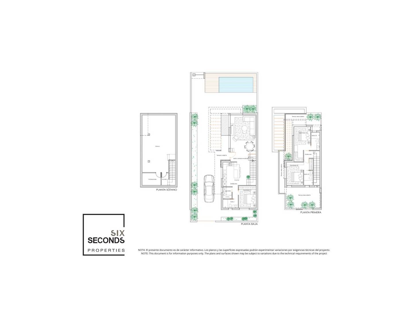 Darüber hinaus verfügen alle Wohneinheiten über einen Seitengarten, eine terrassenförmige Pflasterung für die Veranda und den Parkplatz, den bereits erwähnten Swimmingpool, einen offenen Keller mit Vorinstallationen für Sanitäranlagen, Elektro- und Telekommunikationsanschlüsse, Außen- und Innenbeleuchtung (ausgenommen dekorative Beleuchtung) sowie Vorinstallationen für eine Klimaanlage.