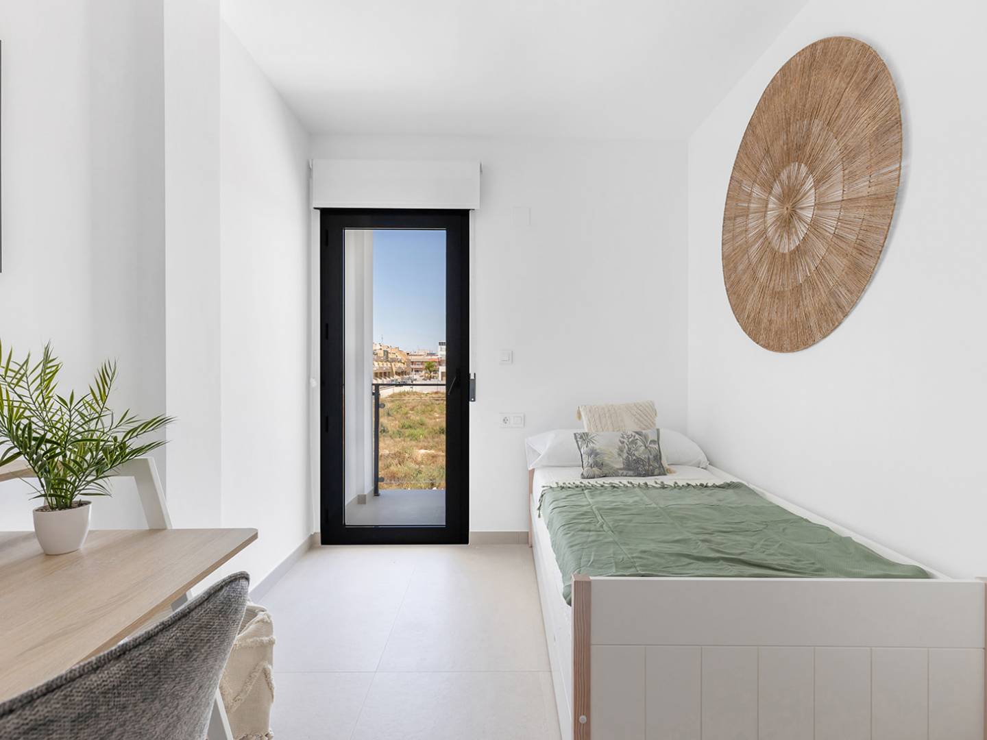 Das Innere der Reihenhäuser in Rafal ist so gestaltet, dass es Komfort und Modernität bietet. Die Böden aus Feinsteinzeug verleihen einen eleganten Touch und sind pflegeleicht, während die elektrischen Rollläden Komfort und Energieeffizienz bieten. Die Einbauschränke in den Schlafzimmern bieten reichlich Stauraum und halten die Ruhebereiche ordentlich und frei von Unordnung. Die Vorinstallation der Klimaanlage stellt sicher, dass die Häuser für die Installation von Klimaanlagen vorbereitet sind, sodass die Bewohner in den wärmeren Monaten eine kühle und komfortable Umgebung genießen können. Die Aufteilung der Häuser, mit Optionen für 3 und 4 Schlafzimmer und 2 Bäder, ist darauf ausgelegt, einen funktionalen Raum zu bieten, der an die Bedürfnisse jeder Familie anpassbar ist.