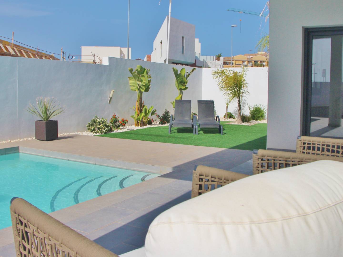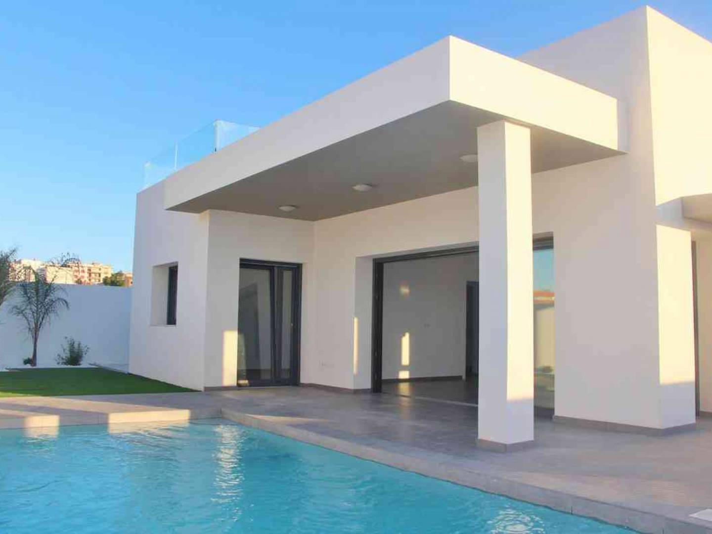 Die Häuser sind mit Feinsteinzeugböden ausgestattet, die Langlebigkeit und Stil vereinen. Elektrische Rollläden bieten Komfort und Sicherheit, während Einbauschränke effiziente Stauraumlösungen bieten. Die Vorinstallation der Klimaanlage sorgt dafür, dass das Raumklima immer angenehm ist. Mit 3 Schlafzimmern und 2 Bädern sind diese Häuser darauf ausgelegt, die Bedürfnisse moderner Familien zu erfüllen.