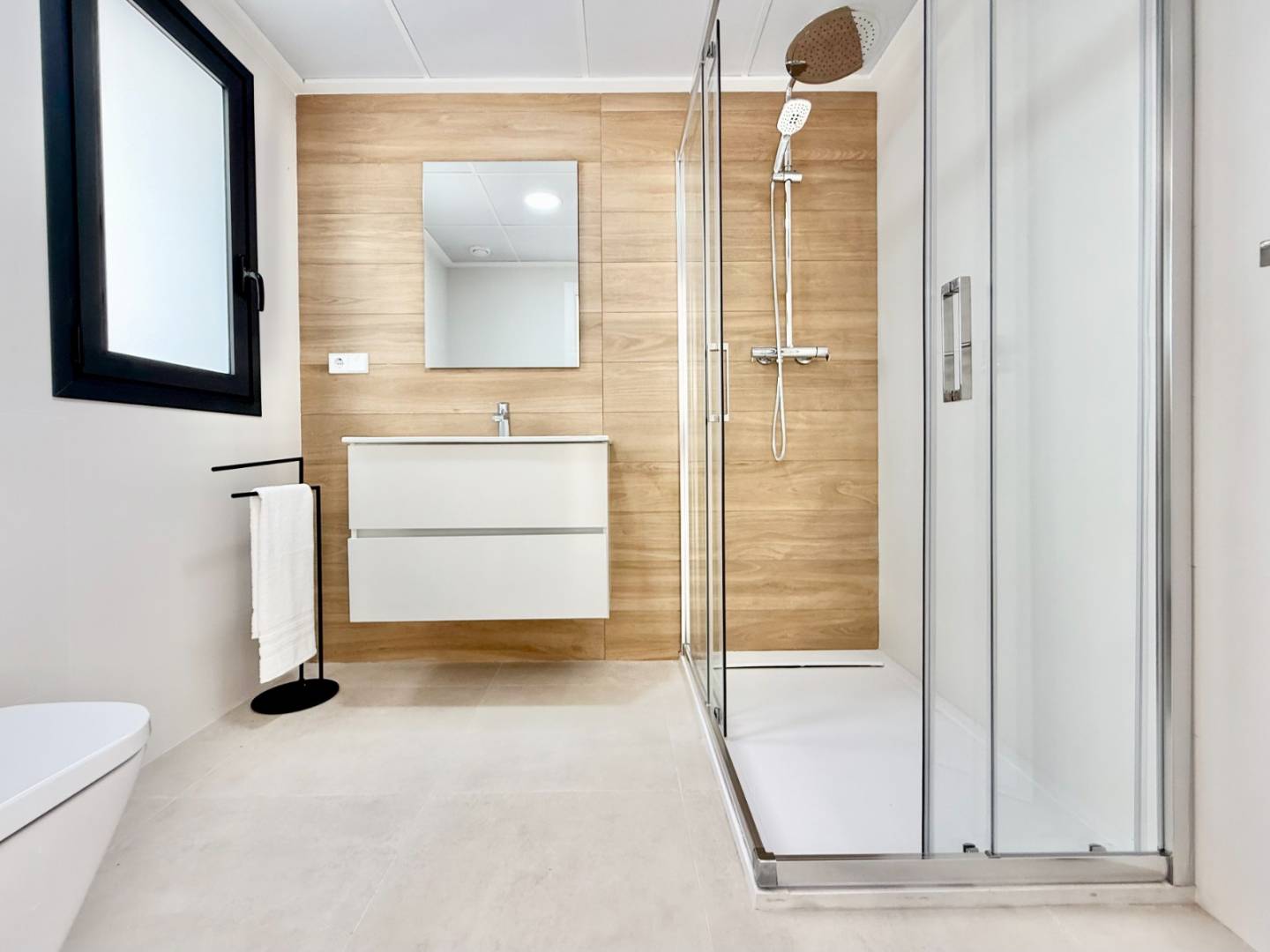 Das Innere der Bungalows ist mit Liebe zum Detail gestaltet und integriert moderne Merkmale, die Komfort und Stil gewährleisten. Die Feinsteinzeugböden verleihen einen eleganten Touch und sind pflegeleicht. Elektrische Rollläden und die enthaltenen Elektrogeräte erleichtern den Alltag, während Einbauschränke effizienten Stauraum bieten. Die Vorinstallation der Klimaanlage ermöglicht es den Bewohnern, das Innenklima nach ihren Vorlieben anzupassen und so das ganze Jahr über eine angenehme Atmosphäre zu gewährleisten.