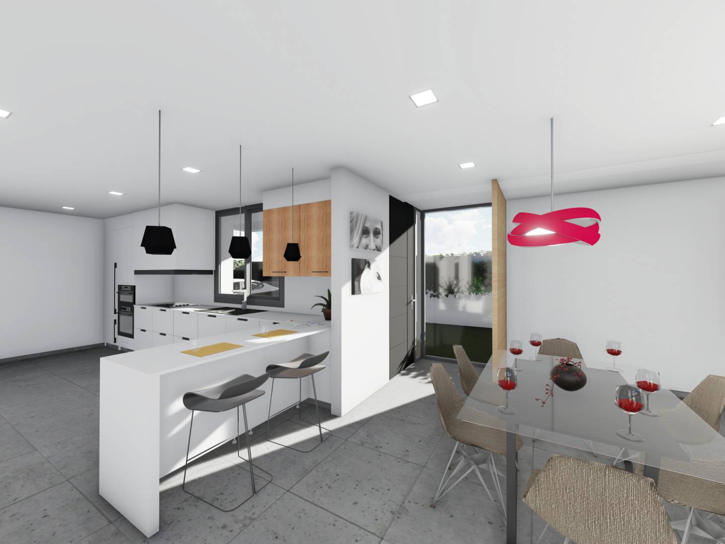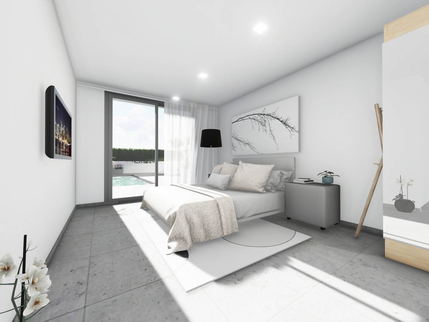 Das Innere der Häuser ist so gestaltet, dass es maximalen Komfort und Funktionalität bietet. Die Keramikböden verleihen einen modernen Touch und sind pflegeleicht. Die Häuser sind mit Haushaltsgeräten ausgestattet, was den Alltag von Anfang an erleichtert. Zudem gibt es Einbauschränke, die den Stauraum optimieren. Die Vorinstallation der Klimaanlage sorgt dafür, dass das Zuhause das ganze Jahr über kühl bleibt. Elektrische Rollläden und die Video-Gegensprechanlage bieten zusätzlichen Komfort und Sicherheit. Die Grundrissoptionen umfassen Häuser mit 2 oder 3 Schlafzimmern und 2 Bädern, die den Bedürfnissen verschiedener Familien gerecht werden.