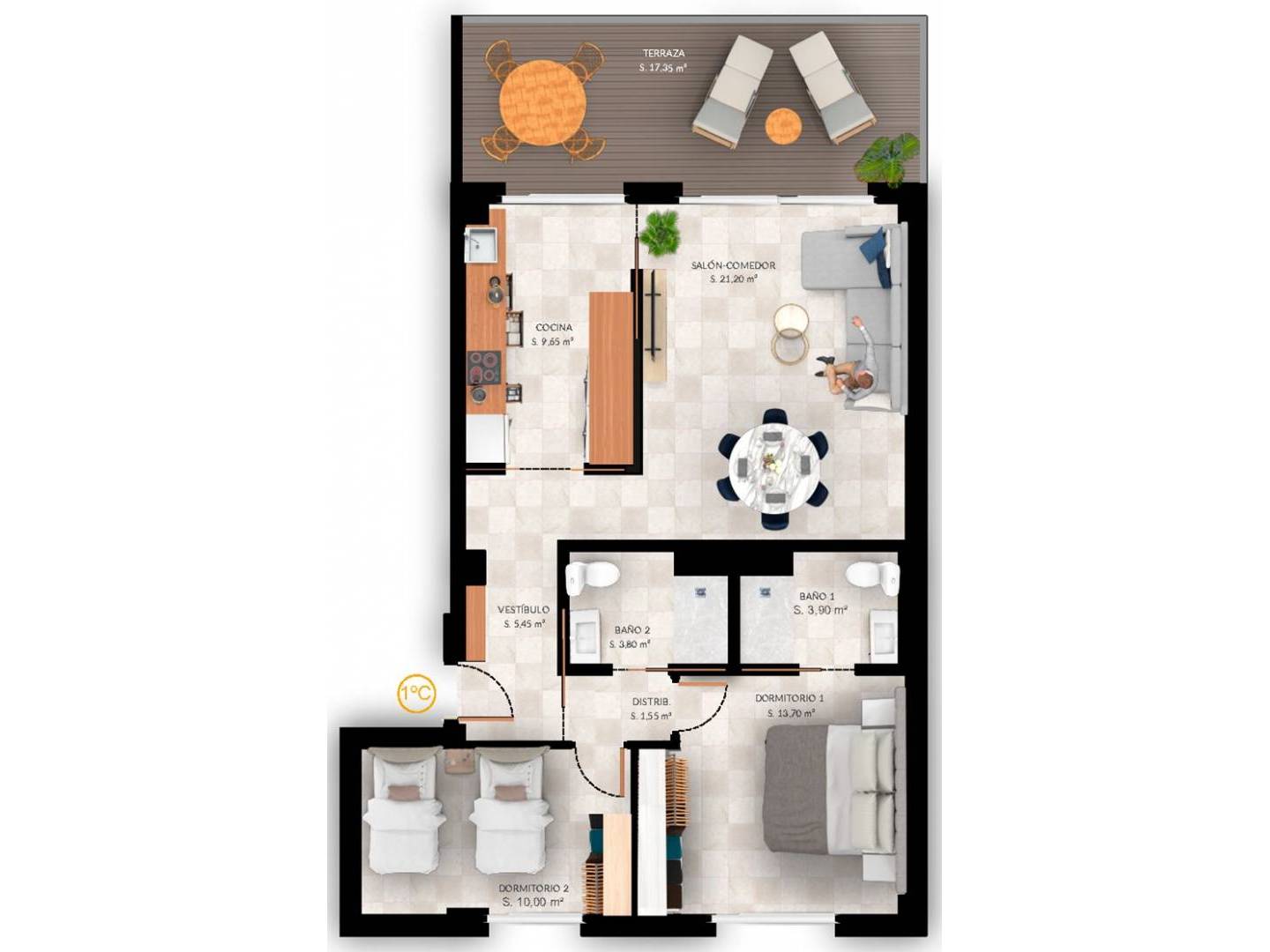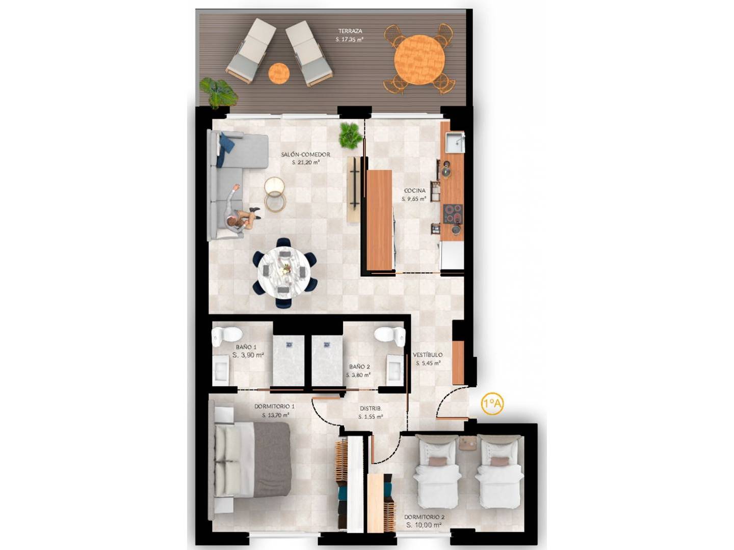 Das Innere der Wohnungen ist mit einem Fokus auf Komfort und Funktionalität gestaltet. Alle Immobilien sind komplett möbliert und mit modernen Geräten ausgestattet. Die Feinsteinzeugböden verleihen Eleganz und Langlebigkeit. Einbauschränke bieten effizienten Stauraum, während die Klimaanlage zu jeder Jahreszeit für ein angenehmes Ambiente sorgt. Mit einer Aufteilung, die zwei Schlafzimmer und zwei Badezimmer umfasst, sind diese Wohnungen darauf ausgelegt, die Bedürfnisse jeder Familie zu erfüllen.