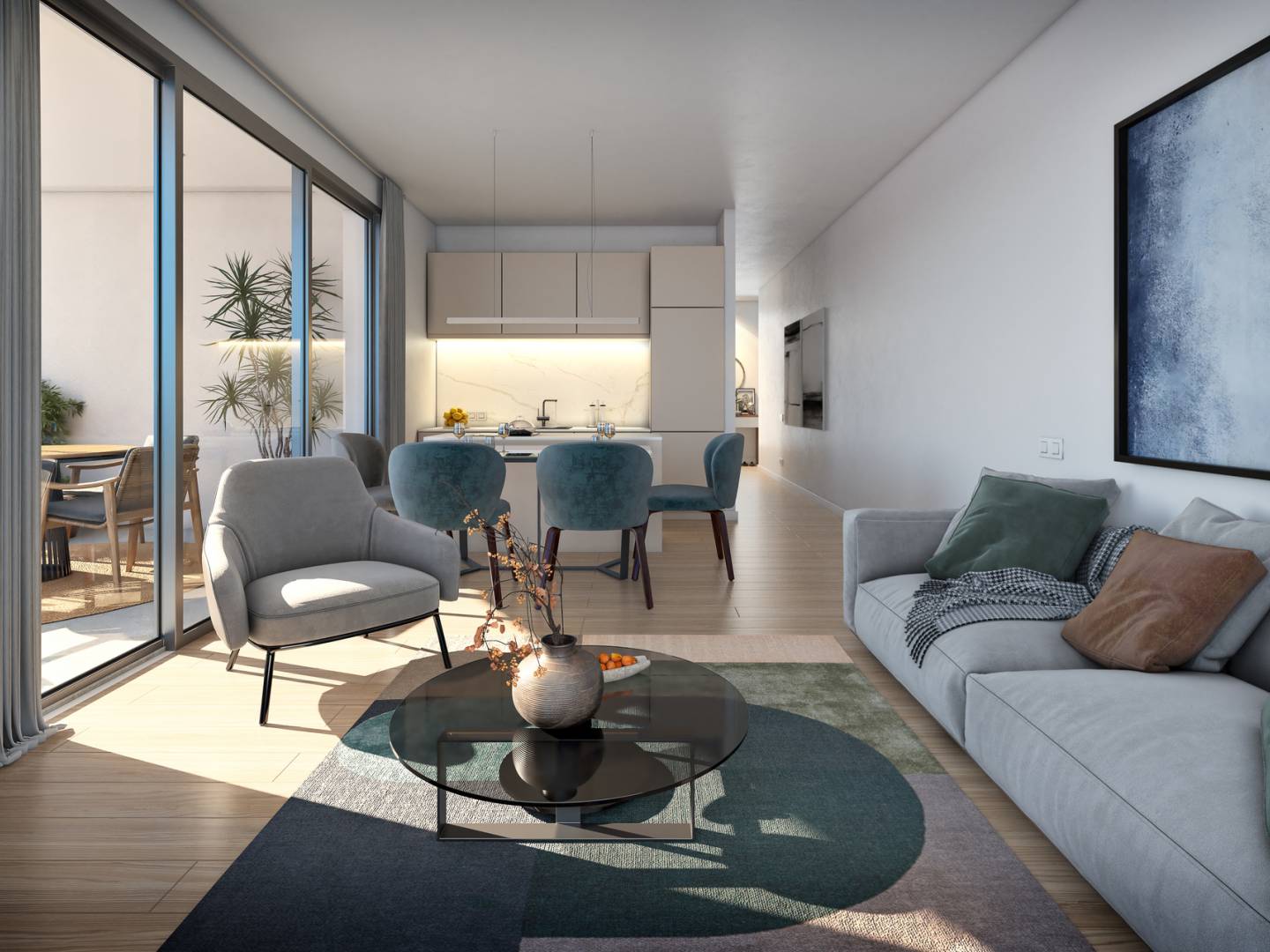 Das Innere der Apartments und Penthäuser ist so gestaltet, dass es eine moderne und einladende Atmosphäre bietet. Die Wohnungen verfügen über zwei Schlafzimmer und zwei Badezimmer, was Raum und Privatsphäre für alle Familienmitglieder garantiert. Die Böden kombinieren Fliesen und Laminat, was einen Hauch von Eleganz und Wärme verleiht. Die Küche ist mit modernsten Geräten ausgestattet, was die täglichen Aufgaben erleichtert. Der Komfort ist durch die Installation von Klimaanlage und elektrischen Rollläden gewährleistet, während Einbauschränke praktische und effiziente Stauraumlösungen bieten. Sicherheit und Komfort werden durch die Einbeziehung einer Video-Gegensprechanlage verstärkt.
