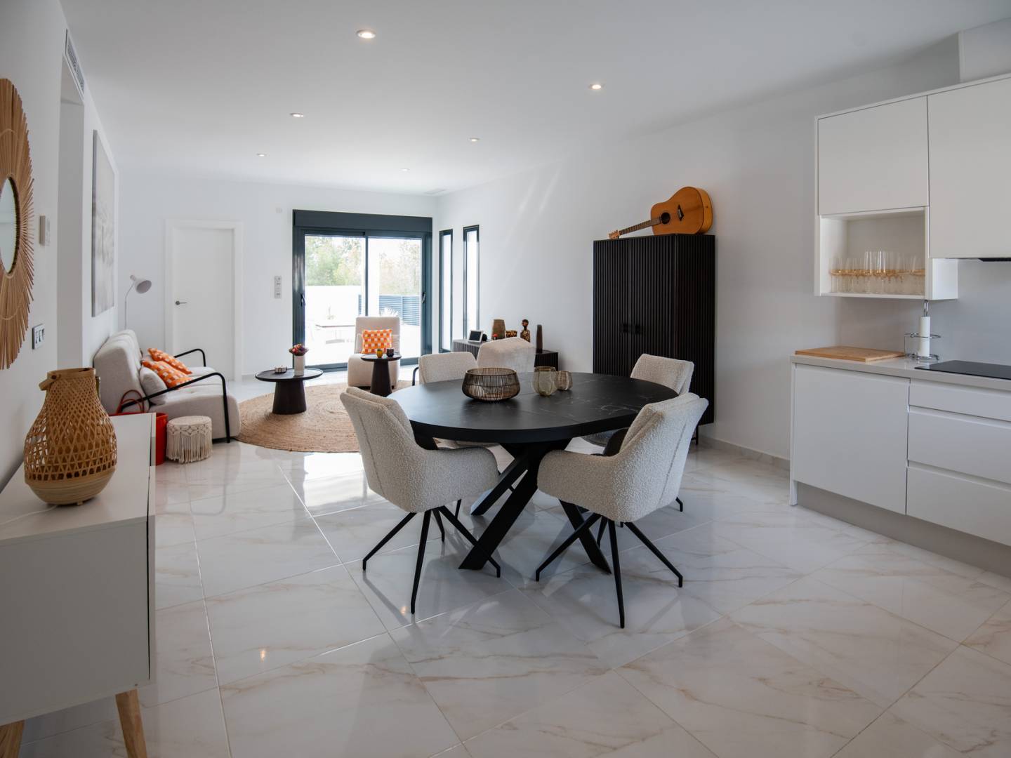 Das Innere dieser freistehenden Häuser ist sorgfältig gestaltet, um Komfort und Funktionalität zu bieten. Die Immobilien sind in Konfigurationen mit 2 oder 3 Schlafzimmern erhältlich, jeweils mit 2 Bädern, was Flexibilität für unterschiedliche Familienbedürfnisse bietet. Die Innenräume sind mit Klimaanlage ausgestattet, die das ganze Jahr über eine angenehme Umgebung gewährleistet. Eingebaute Schränke bieten effizienten Stauraum, während die enthaltenen Geräte und Möbel einen sofortigen Einzug erleichtern. Der Keramikboden verleiht einen modernen Touch und ist pflegeleicht. Darüber hinaus bietet die Video-Gegensprechanlage ein zusätzliches Maß an Sicherheit und Komfort.