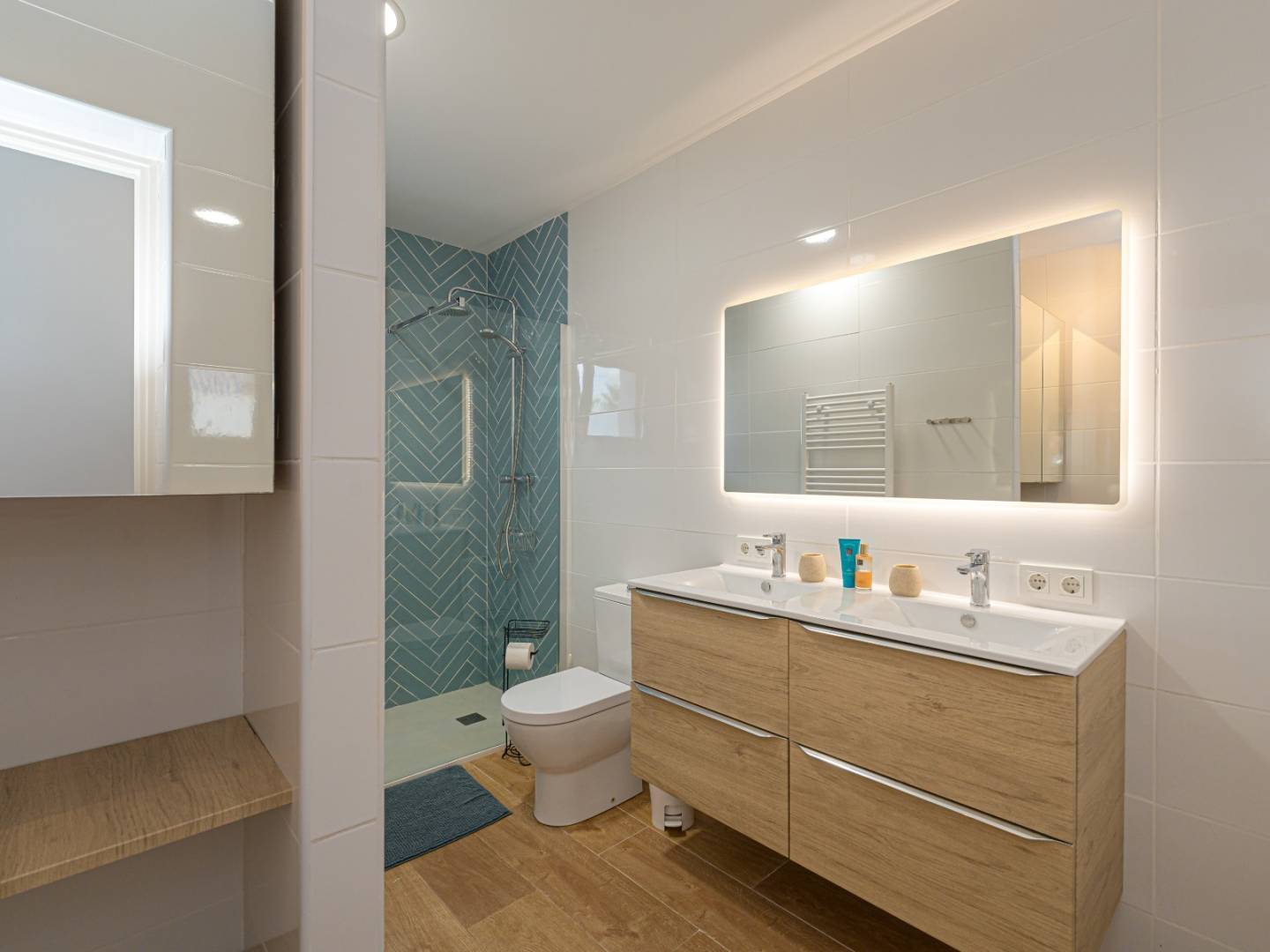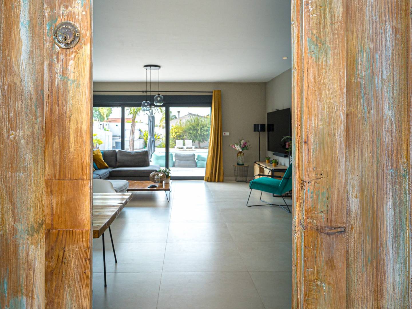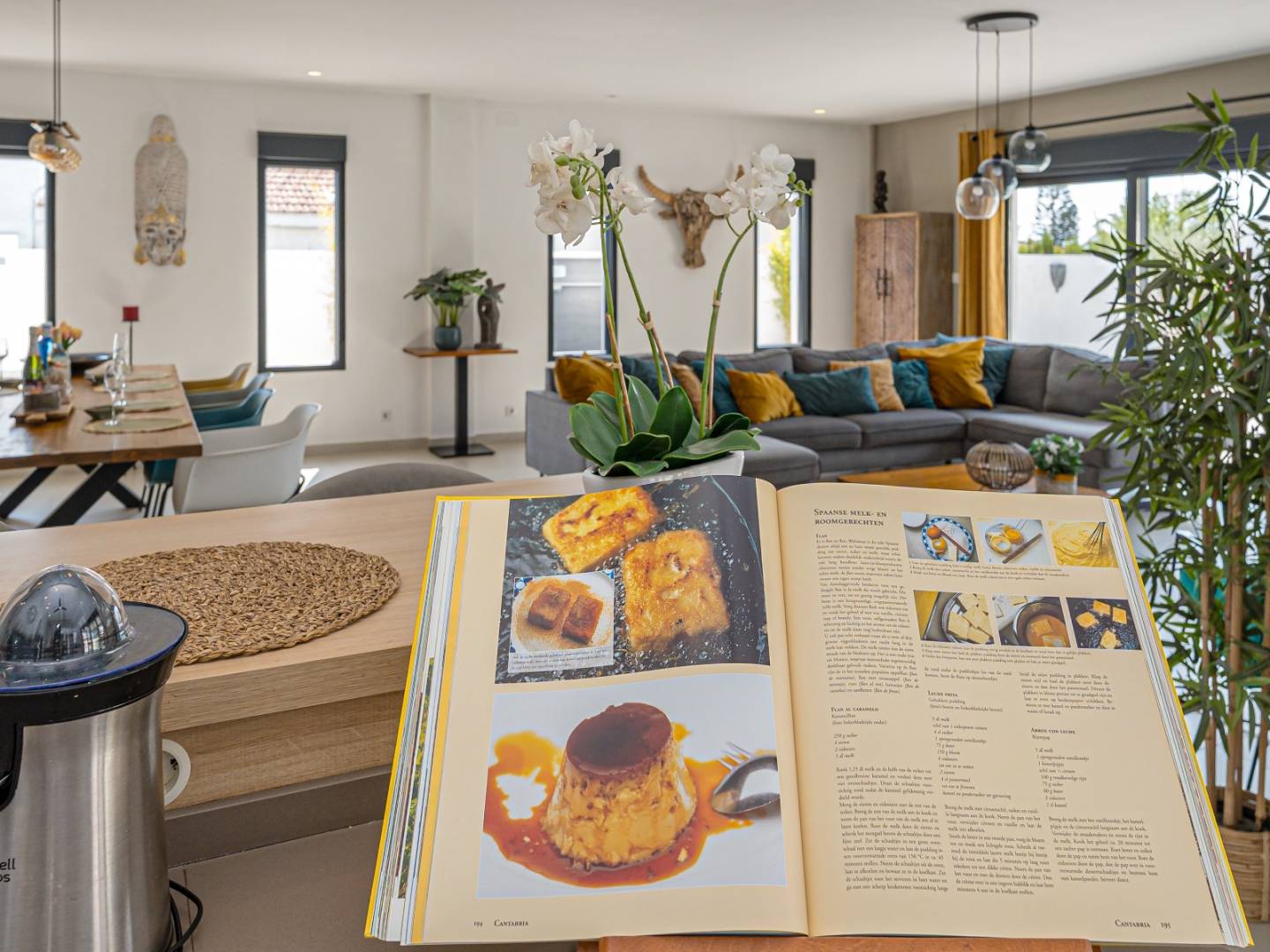 Der Innenraum ist um eine geräumige Eingangshalle angeordnet, die in einen hellen, offenen Wohnbereich führt, in dem eine voll ausgestattete moderne Küche integriert ist. Weiße Möbel und Naturholz schaffen eine anspruchsvolle und einladende Atmosphäre.