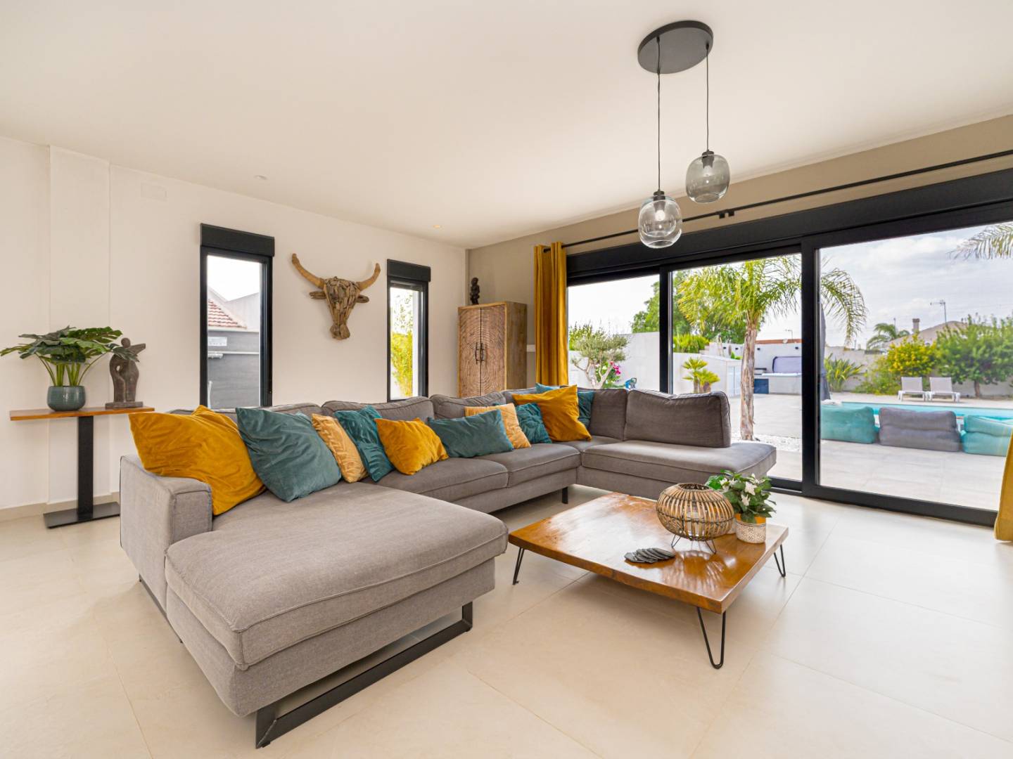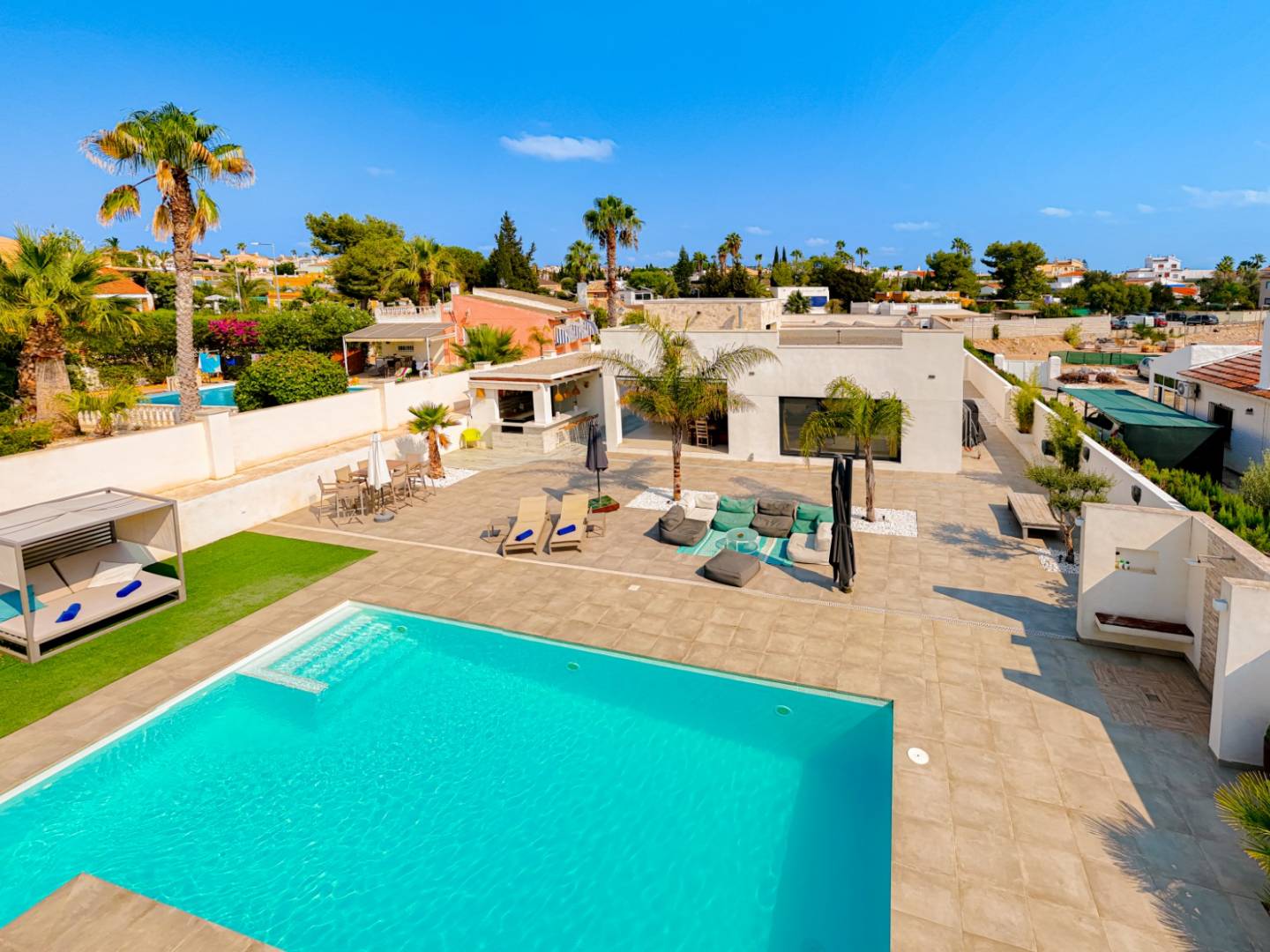 In der ruhigen Wohngegend Oasis de La Marina an der Costa Blanca gelegen, bietet diese atemberaubende, moderne Villa auf einer Ebene viel Platz, Privatsphäre und optimalen Komfort. Das Anwesen verfügt über 280 m² Wohnfläche auf einem komplett umzäunten 1.350 m² großen Grundstück und schafft so ein exklusives und sicheres Ambiente.