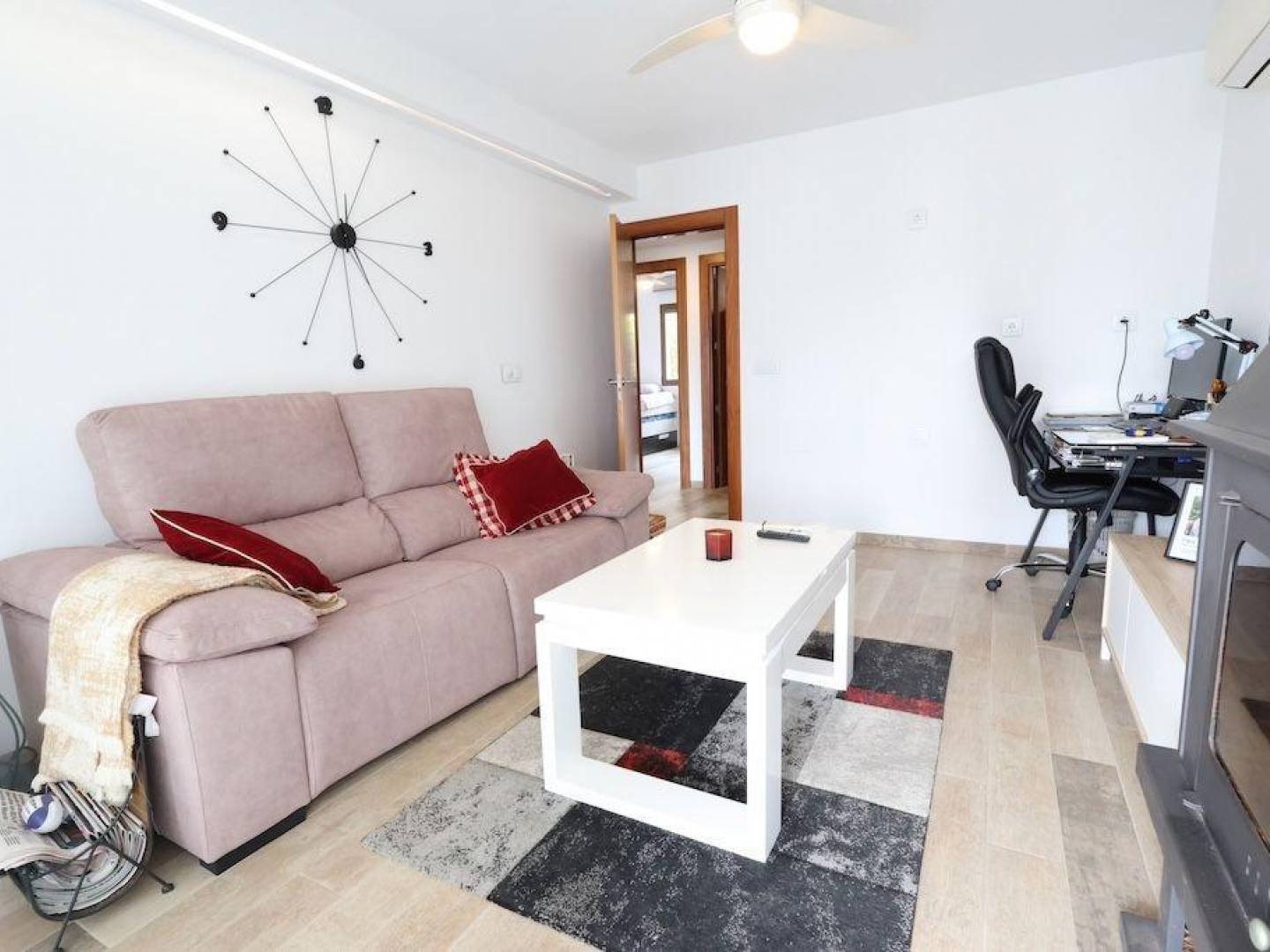 Wunderschön renoviertes, nach Süden ausgerichtetes Maisonette-Reihenhaus in einer ruhigen Wohnstraße in Cabo Roig, nur wenige Gehminuten vom Meer entfernt. Das großzügige Anwesen bietet eine Wohnfläche von ca. 100 m² und einen ca. 50 m² großen privaten Garten mit Grill und Backofen – ideal, um das ganze Jahr über die Natur zu genießen. Es befindet sich in einer geschlossenen Wohnanlage mit Parkplätzen und gepflegten Grünflächen. Ein besonderes Highlight ist die Aufteilung auf zwei Etagen mit separaten Eingängen und Räumen, die eine unabhängige Nutzung ermöglichen. Durch den Einbau einer Küche im Obergeschoss ließe sich das Haus problemlos in zwei separate Wohneinheiten aufteilen und bietet somit eine attraktive Investitionsmöglichkeit: Vermieten Sie eine Hälfte und nutzen Sie die andere selbst oder als Ferienwohnung. Insgesamt verfügt das Haus über 4 Schlafzimmer und 3 Badezimmer. Aufteilung: Erdgeschoss: Küche mit Zugang zu einem geräumigen Wohn-Esszimmer mit Einbauschrank und Abstellraum, 1 Schlafzimmer und 1 Badezimmer mit Dusche. Obergeschoss: Verglaste Terrasse mit Glasvorhängen und freiem Ausblick, Wohn-Esszimmer mit Kamin und Klimaanlage, 3 Doppelschlafzimmer mit Einbauschränken und 2 Badezimmer mit Dusche. Die Wohnanlage selbst verfügt zwar nicht über einen Swimmingpool, jedoch befindet sich nur wenige Meter entfernt ein Schwimmbad, das gegen Gebühr genutzt werden kann. Eine vielseitige, helle, geräumige und gut gelegene Immobilie, ideal als Kapitalanlage, als Hauptwohnsitz oder für Ihren Urlaub am Meer.
