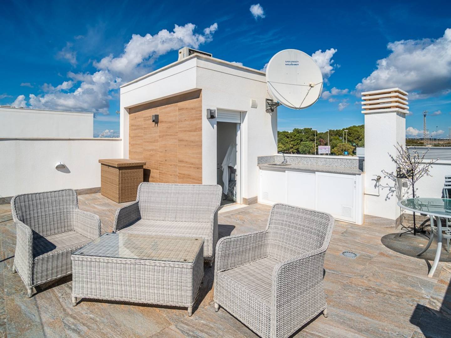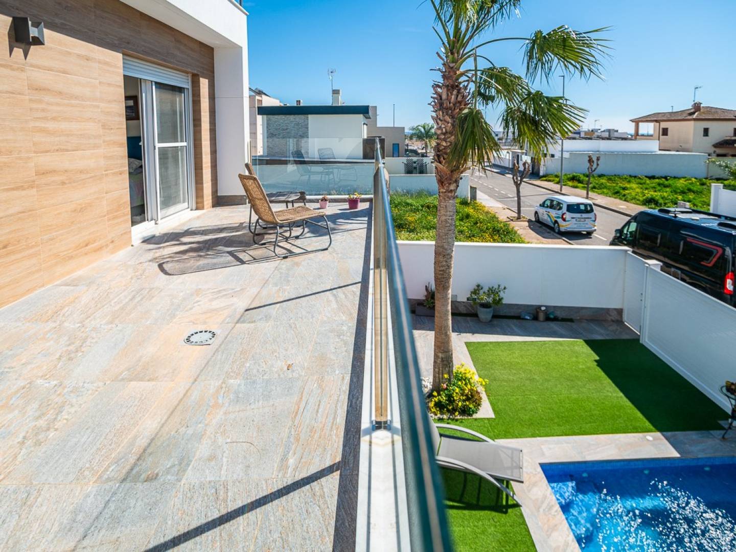 Die Villa wurde so gestaltet, dass sie das außergewöhnliche Klima der Costa Blanca optimal nutzt. Der elegante Privatgarten bietet einen einladenden Sitzbereich und einen privaten Swimmingpool – eine wahre Oase der Ruhe, in der Sie ungestört entspannen können. Zum Anwesen gehört außerdem ein überdachter Raum , der sich ideal als Gästehaus, Spielzimmer oder zusätzliches Wohnzimmer eignet, sowie ein praktischer Abstellraum hinter der Küche.