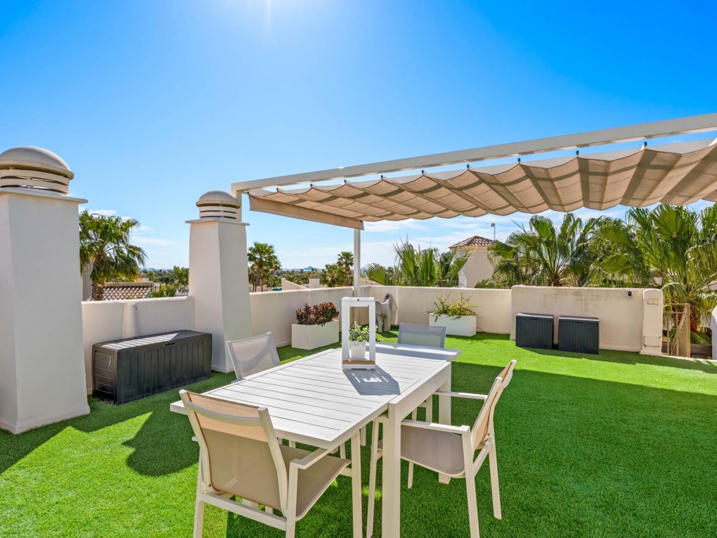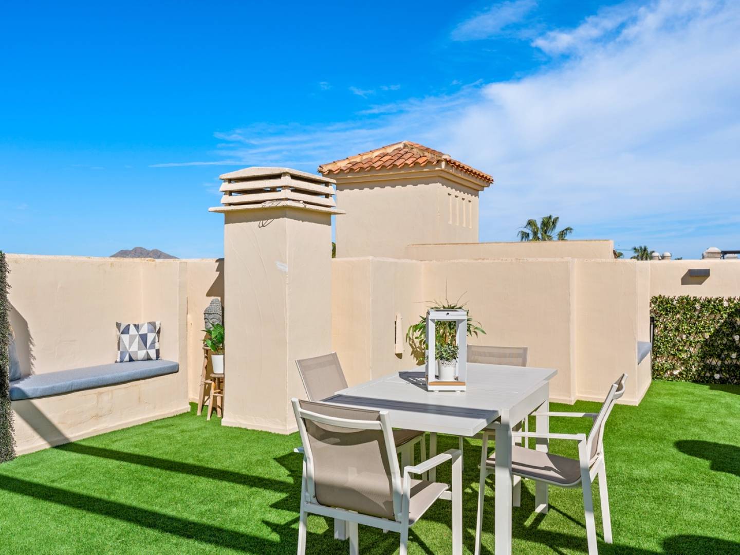 Entdecken Sie dieses atemberaubende , bezugsfertige Designerapartment im renommierten Roda Golf & Beach Resort , einer der begehrtesten Adressen an der Costa Cálida . Dank der exzellenten Südausrichtung profitiert das Apartment den ganzen Tag über von optimalem Tageslicht , sodass Sie die großzügige Terrasse mit Blick auf den Garten und die spektakulären Sonnenuntergänge in vollen Zügen genießen können. Von der Terrasse führt eine Treppe zu einer beeindruckenden privaten Dachterrasse mit Panoramablick – der ideale Ort zum Entspannen, Sonnenbaden oder um laue Abende im Freien in absoluter Privatsphäre zu verbringen.