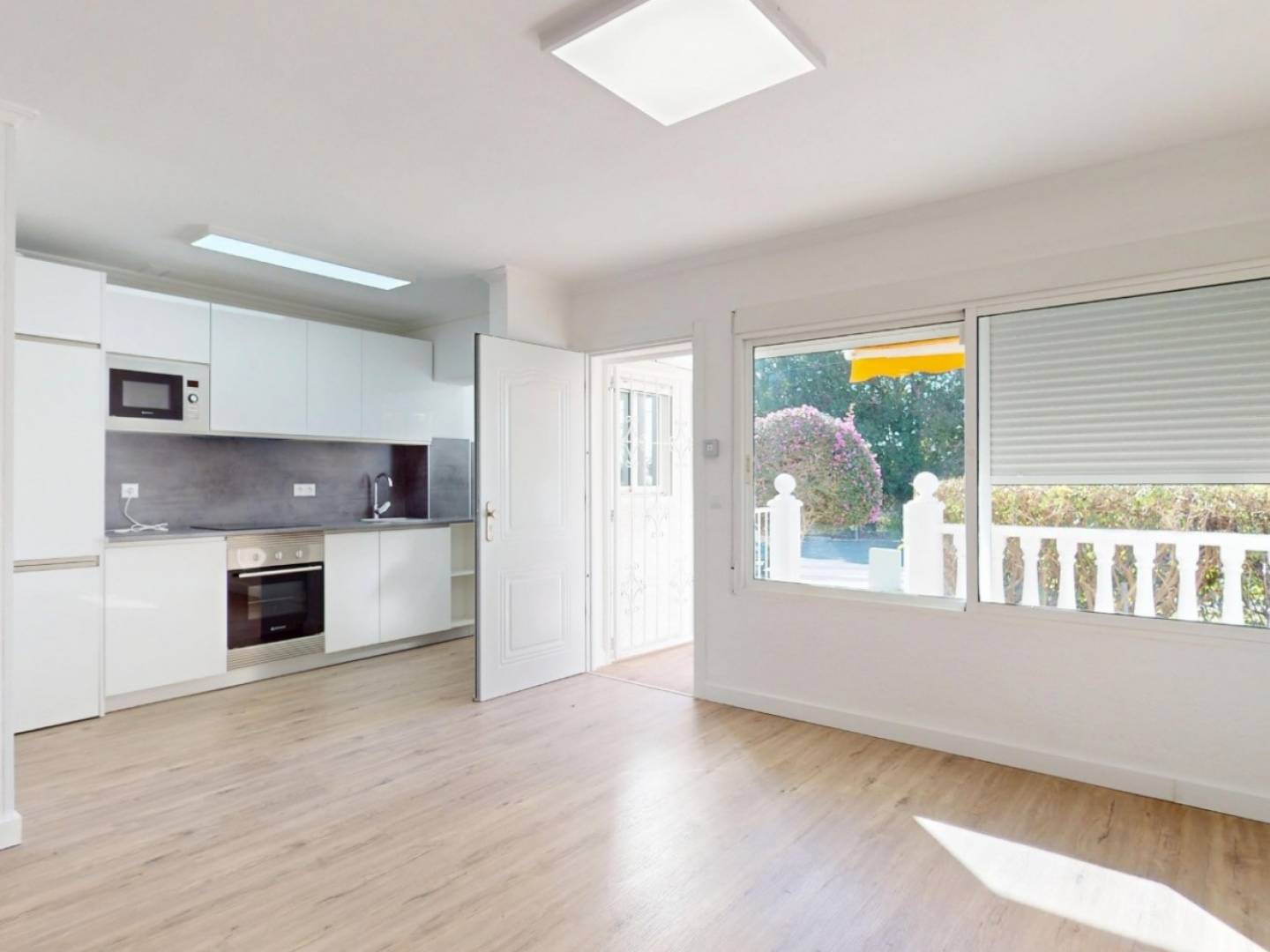 Sie verfügt über zwei Schlafzimmer mit Einbauschränken, ein modernes Bad mit Dusche und eine neue voll ausgestattete Küche. Das helle Wohnzimmer bietet direkten Zugang zu den Außenbereichen.