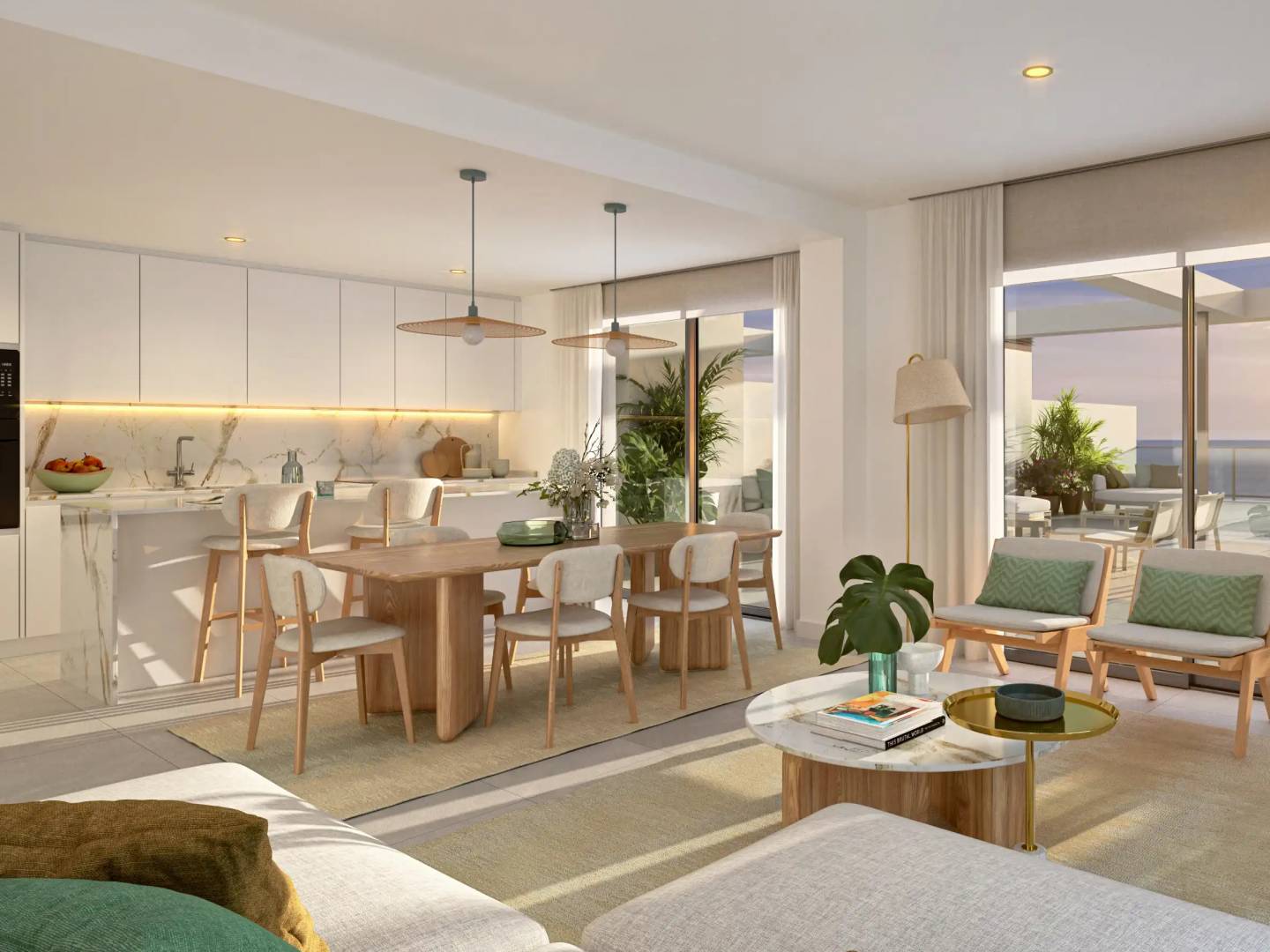 Das Innere der Wohnungen ist sorgfältig gestaltet, um maximalen Komfort und Funktionalität zu bieten. Die Apartments und Erdgeschosse verfügen über Feinsteinzeugböden, die einen modernen Touch verleihen und pflegeleicht sind. Die Küchen sind mit hochwertigen Geräten ausgestattet, um sicherzustellen, dass jedes Detail durchdacht ist, um den Alltag zu erleichtern. Einbauschränke bieten effizienten Stauraum und optimieren den Platz in jedem Raum. Die Aufteilung umfasst Optionen von einem bis vier Schlafzimmern, alle mit zwei Bädern, um Komfort für Familien unterschiedlicher Größe zu gewährleisten.