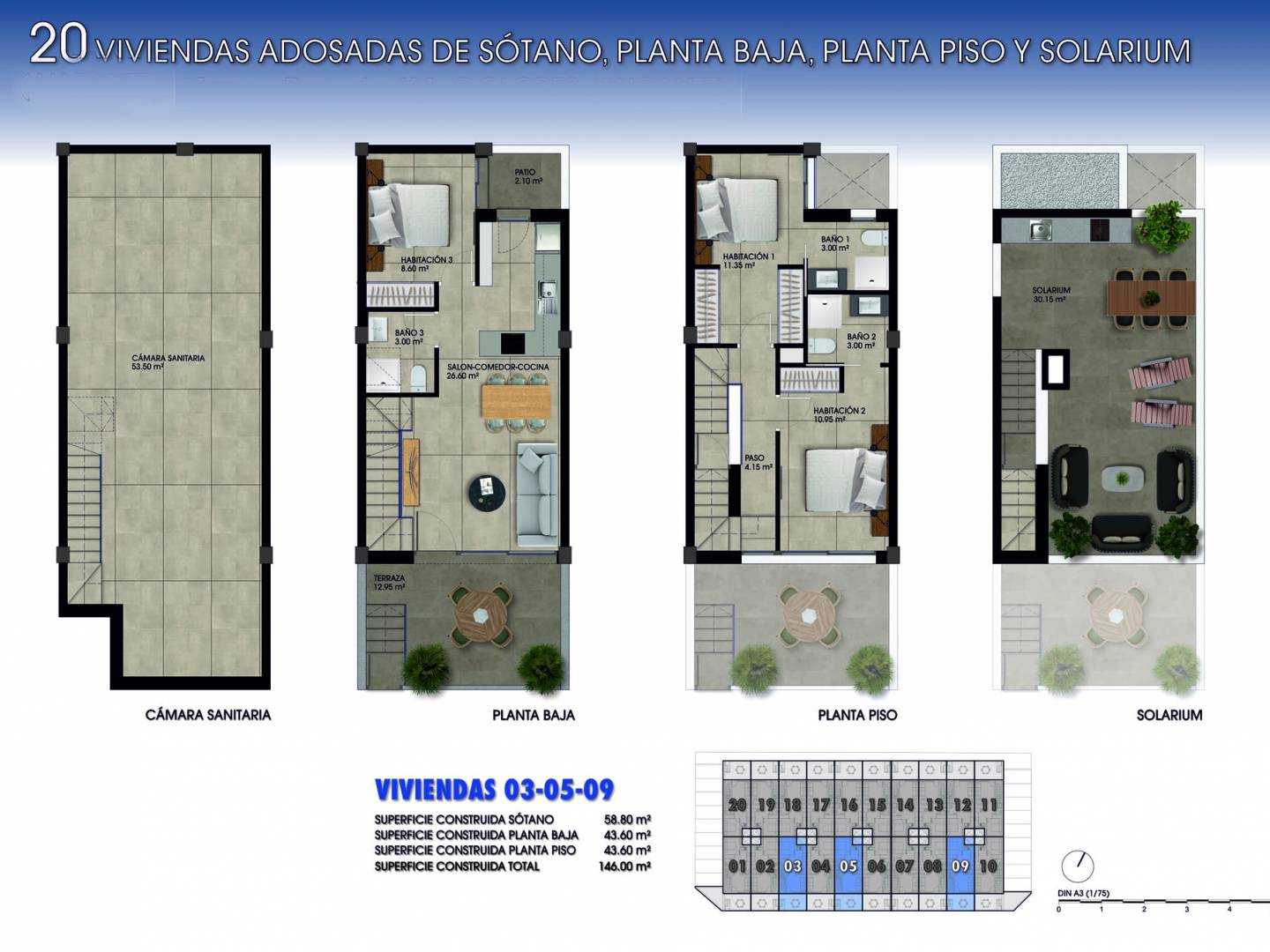 Die Außenansicht dieser Reihenhäuser ist sowohl stilvoll als auch praktisch. Jede Immobilie verfügt über eine geräumige Terrasse, ideal für das Essen im Freien oder einfach zum Genießen der Sonne. Mit der Ergänzung eines Solariums haben die Bewohner den perfekten Raum zur Entspannung und genießen das mediterrane Klima. Eingebaute Kleiderschränke sorgen für ausreichend Stauraum und erhöhen die Funktionalität und Attraktivität der Innenräume.