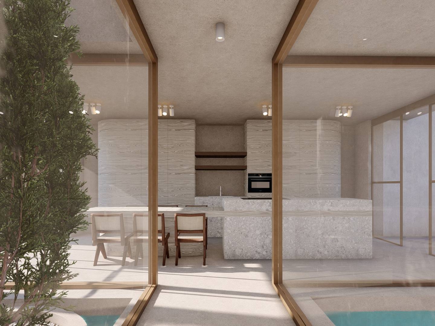 Entering the 175 m2 plot, the eye is immediately drawn to the elongated pool that runs through the centre of the plot. The pool is 30 m2 in total and with its unique position immediately sets the tone for what you can expect in the rest of the house.