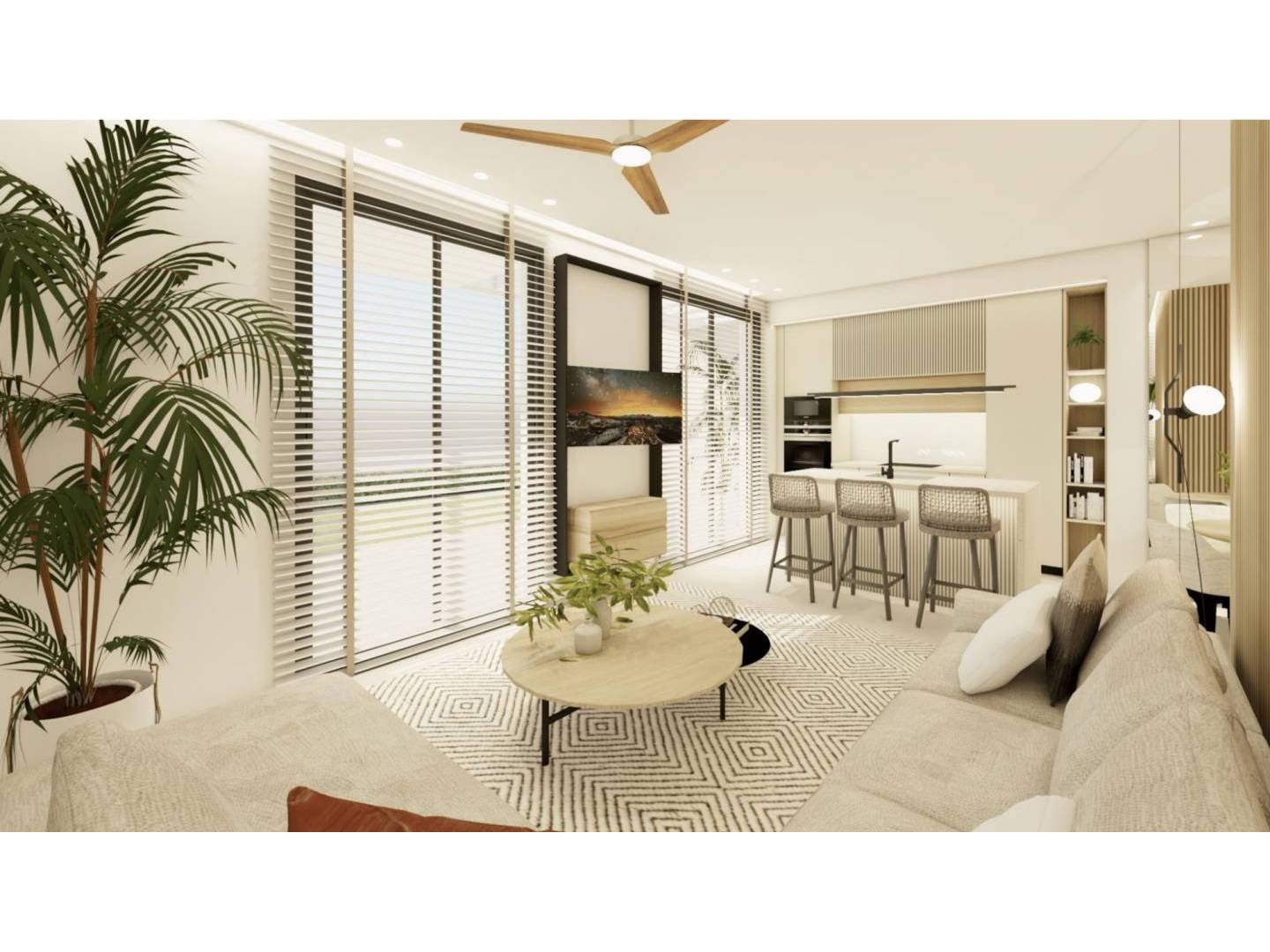 The properties are 3/2 bedrooms and 2 bathrooms with views of the large lake and green areas of this large luxury resort. The ground floor flats include a private garden and terrace, the 1st and 2nd floors include a beautiful roof terrace and the penthouse offers a roof terrace and solarium.