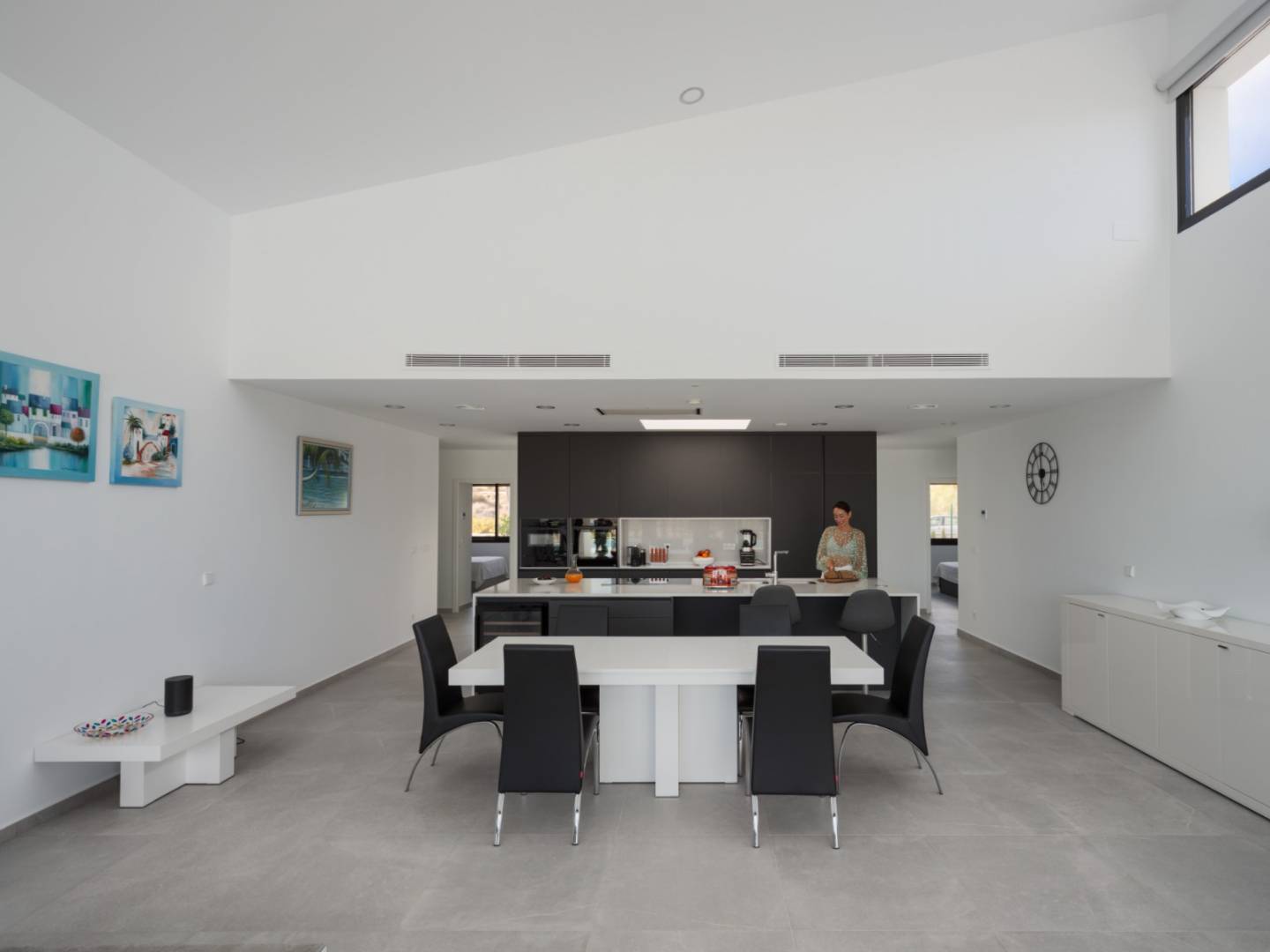 This particular villa is a single-family house on one level, with a total of 4 bedrooms, 4 bathrooms, private garden with swimming pool and solarium. It blurs the boundaries inside and outside, front and back. Created with its feet on the ground, with a contemporary and minimalist design but with a strong personality, this villa displays large volumes in its rooms spread over the same floor to create an imposing space with maximum habitability and accessibility.