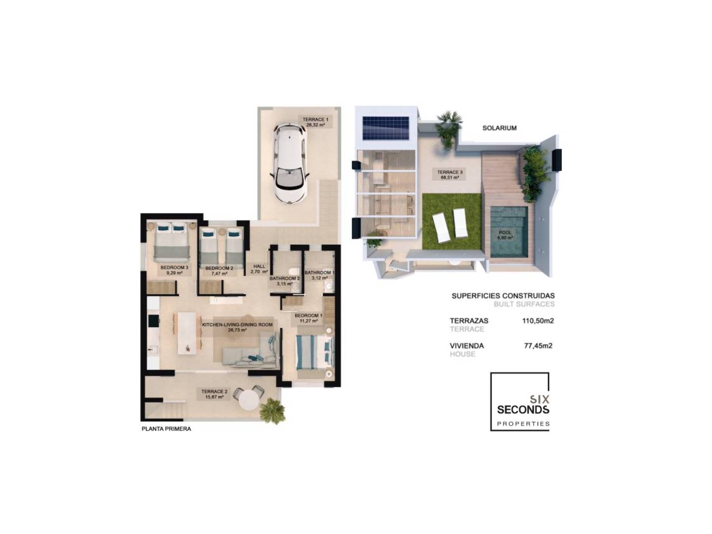 Here you can choose between ground floor apartments with gardens and first floor apartments with solariums, all built to a high standard and of excellent quality. Each apartment features an open-plan living and kitchen area, a private pool , and parking.